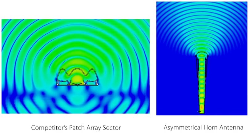 Основните секторни антени с решетка имат изключително широка диаграма на излъчване по азимут и изключително плоска в равнината на издигане. Ако AP е разположен на висока кула, клиентите в близост до кулата страдат от ниско ниво на AP сигнал. Асиметричните рупорни TP антени осигуряват ценни допълнителни градуси в ширината на елевационния лъч, като свиват нулевата зона, като същевременно запазват увеличеното усилване за производителност на дълги разстояния.