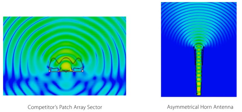 Основните секторни антени с решетка имат изключително широка диаграма на излъчване по азимут и изключително тясна в равнината на издигане. Ако AP е разположен на висока кула, клиентите в близост до кулата страдат от ниско ниво на AP сигнал. Асиметричните рупорни CC антени осигуряват ценни допълнителни степени на ширината на елевационния лъч, като свиват нулевата зона, като същевременно запазват повишеното усилване за производителност на дълги разстояния.