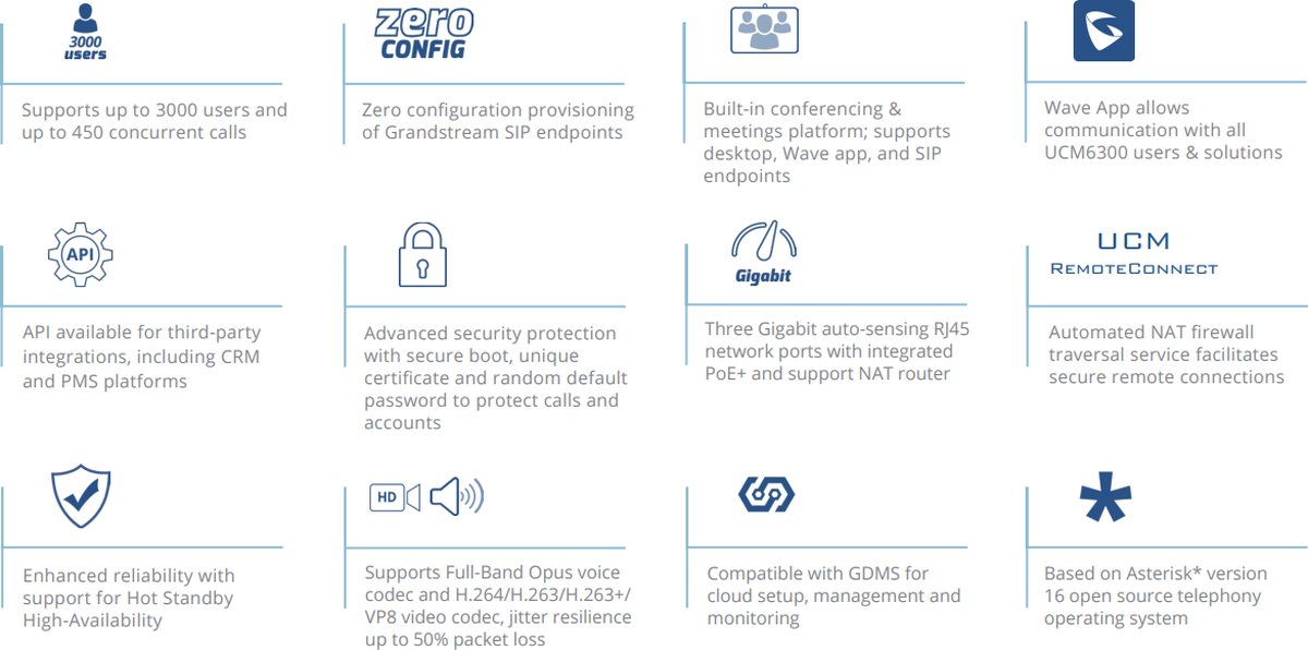 Това е автоматичен превод. Оригиналния текст може да видите тукСерията UCM6300 позволява на бизнеса да изгражда мощни и мащабируеми решения за унифицирана комуникация и сътрудничество. Тази серия IP PBX предоставя платформа, която обединява цялата бизнес комуникация в една централизирана мрежа, включително гласови разговори, видеоконферентна връзка, видеонаблюдение, уеб срещи, данни, анализи, мобилност, достъп до съоръжения, домофони и други . Серията UCM6300 поддържа до 3000 потребители и включва вградено решение за уеб срещи и видеоконферентна връзка, което позволява на служителите да се свързват от настолни компютри, мобилни устройства, устройства от серията GVC и IP телефони. Тя може да се сдвои с екосистемата UCM6300, за да предложи хибридна платформа, която комбинира контрола на локална IP PBX с отдалечения достъп на облачно решение. Екосистемата UCM6300 се състои от приложението Wave за настолни компютри, уеб и мобилни устройства, което предоставя център за отдалечена съвместна работа, и UCM RemoteConnect, услуга за преминаване през облачен NAT за осигуряване на сигурни отдалечени връзки. Серията UCM6300 предлага също така настройка и управление в облака чрез GDMS и API за интеграция с платформи на трети страни. Като предлага висококачествено решение за унифицирани комуникации и сътрудничество, оборудвано с набор от инструменти за мобилност, сигурност, срещи и сътрудничество, серията UCM6300 предоставя мощна платформа за всяка организация .