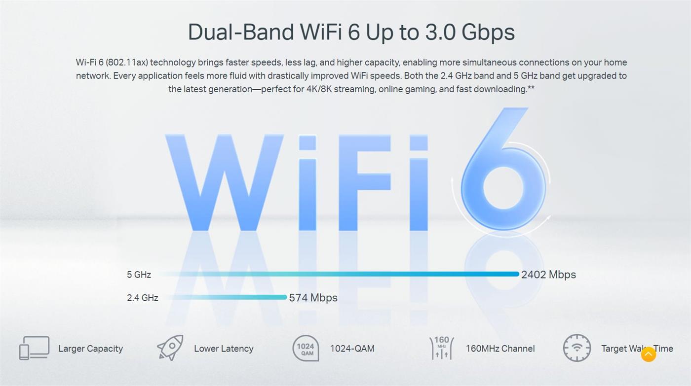 Двубандов WiFi 6: Скорости до 3000 Mbps—2402 Mbps на 5 GHz и 574 Mbps на 2,4 GHz.* Multi-Gig връзки: Преодолявайте пречките от 1Gbps с 2,5 G WAN порт и множество гигабитови LAN портове за по-бърз достъп до интернет и кабелни връзки. Подсилено покритие: Четири високопроизводителни антени и технология за формиране на лъч се комбинират, за да разширят силен и надежден WiFi в целия ви дом. Повече връзки: OFDMA и MU-MIMO технологиите увеличават капацитета и позволяват едновременно предаване към повече устройства. Съвместим с EasyMesh: Създайте интелигентна мрежеста мрежа с безпроблемно покритие и по-голяма гъвкавост, базирана на стандартна мрежеста технология. § Подобрена сигурност: WPA3 криптиране, Multi-SSID и родителски контрол осигуряват персонализирано и по-безопасно онлайн изживяване. Светкавично бързо споделяне на медии: USB 3.0 ви позволява да споделяте вашите медийни ресурси до 10 пъти по-бързо от USB 2.0. Лесна настройка: Настройте вашата мрежа за минути с мощното приложение Aginet. Дистанционно управление: Поддържат се TAUC (TP-Link Aginet Unified Cloud, базиран на TR-369) и TR-069, TR-098, TR-181, TR-111, TR-143 протоколи.