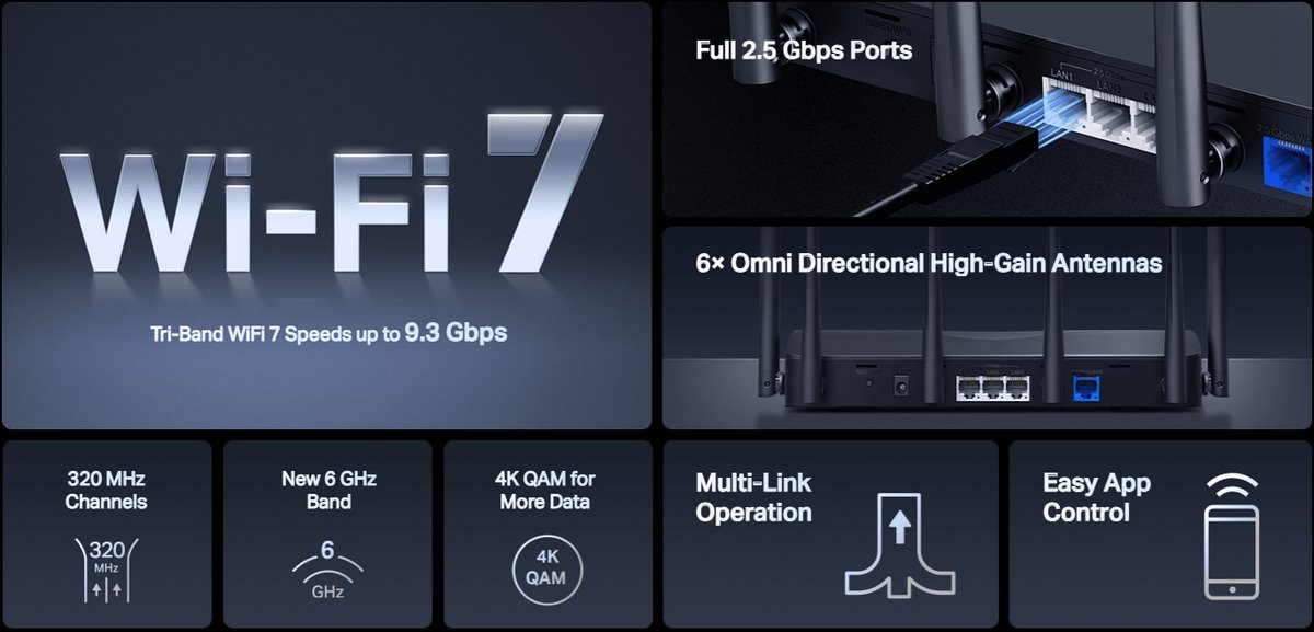 - Трибандов Wi-Fi 7 - 6GHz, 5GHz и 2.4GHz