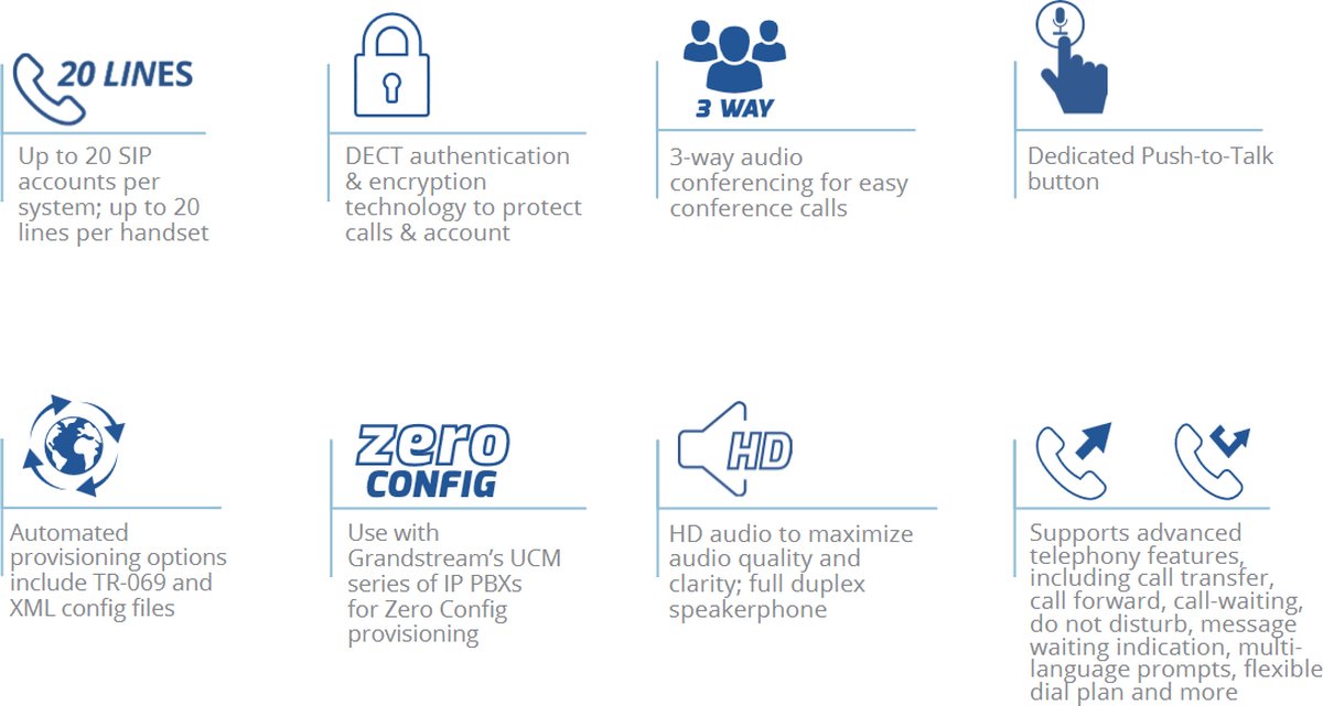 - Поддържа разширени телефонни функции, включително прехвърляне на повиквания, пренасочване на повиквания, изчакване на повикване, режим „Не безпокойте“, индикация за изчакващо съобщение, многоезични подкани, гъвкав план за набиране и други