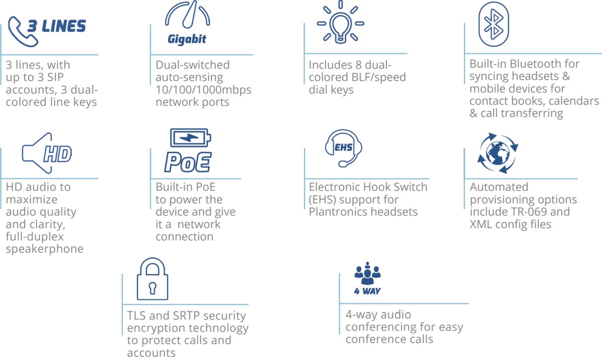 - Поддържа 3 линии, 3 SIP акаунта и 4-странна гласова конференция