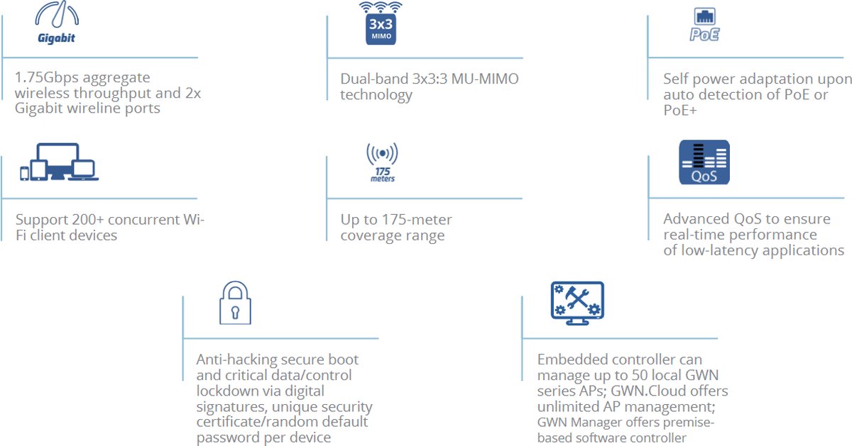 - Вграденият контролер може да управлява до 50 локални точки за достъп от серията GWN; GWN.Cloud предлага неограничено управление на точки за достъп; GWN Manager предлага софтуерен контролер, базиран на място