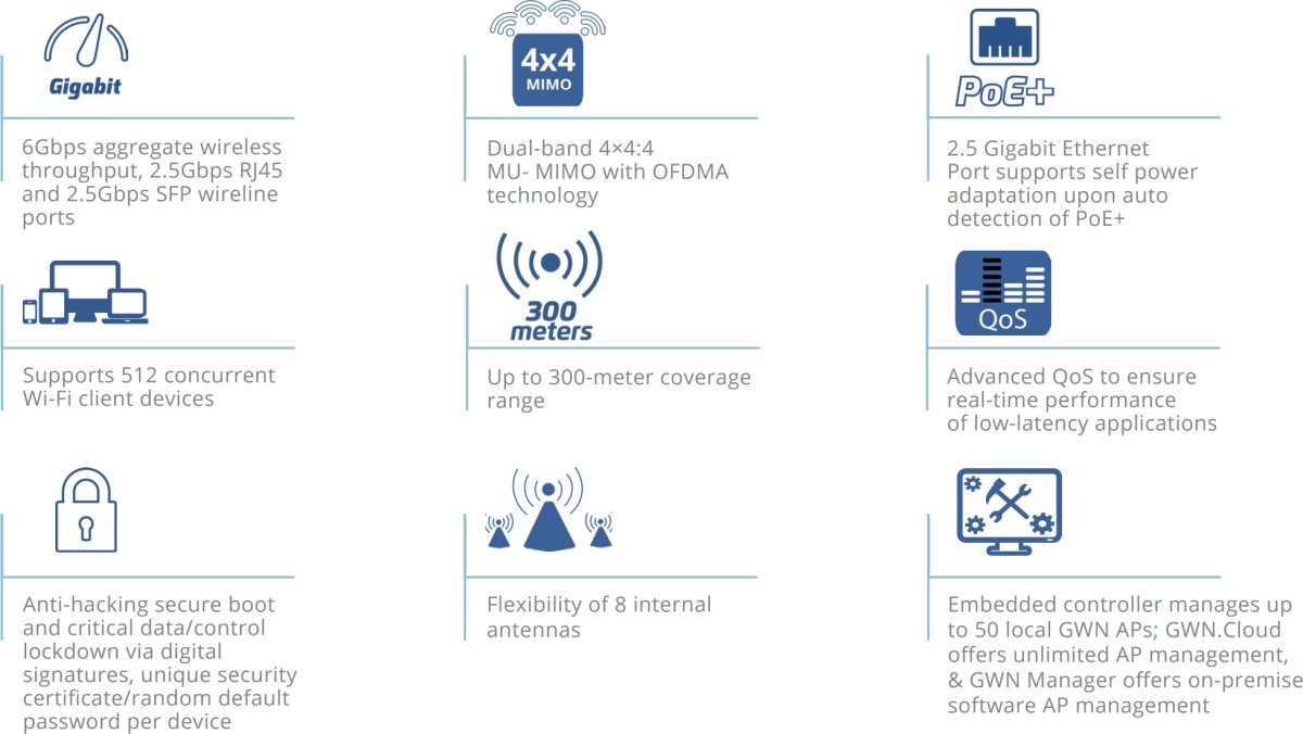 - До 6 Gbps общ безжичен капацитет, 2.5 Gbps RJ45 и 2.5 Gbps SFP кабелни портове