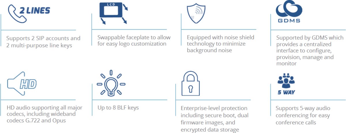 - Поддържа 2 SIP акаунта и 2 многофункционални ключа за линии