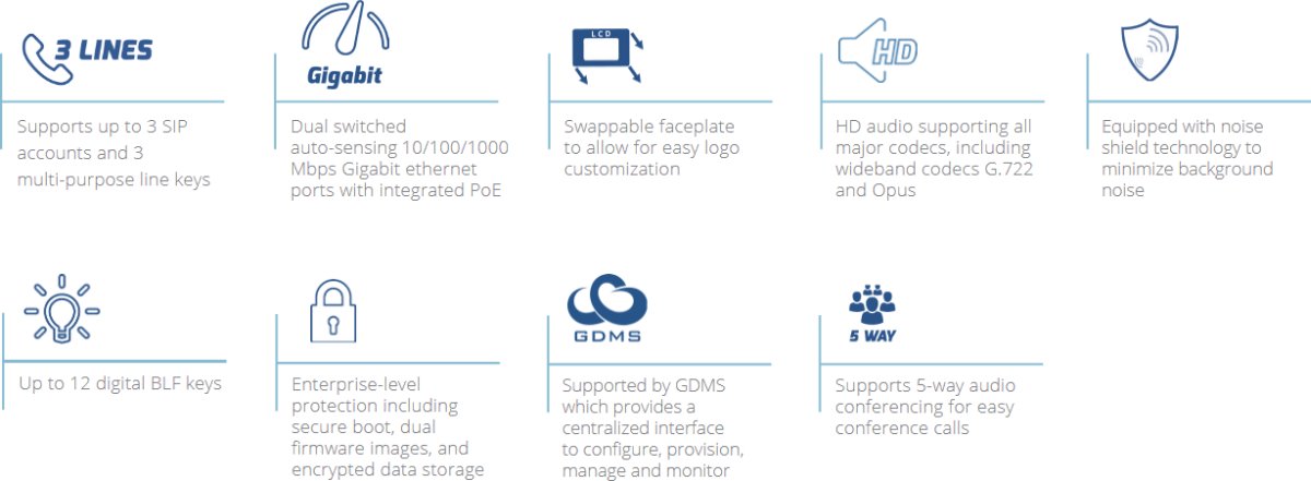 - Поддържа 3 SIP акаунта и 3 многофункционални ключа за линии