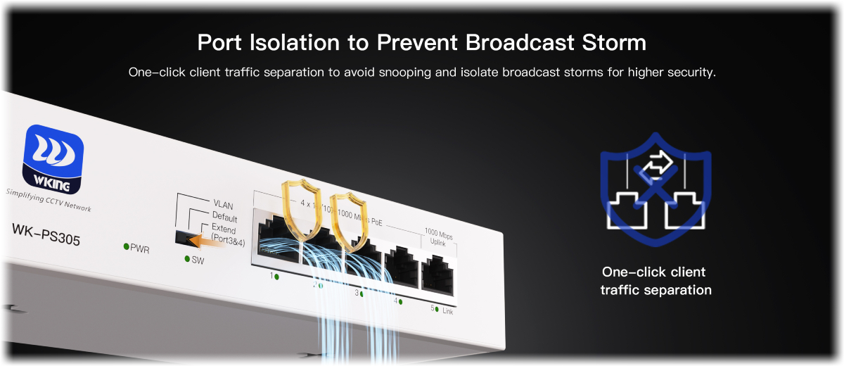 В режим VLAN, отделните PoE портове са изолирани и могат да комуникират само с uplink порта. Това предотвратява нежелан broadcast трафик между устройствата, предпазва мрежата от претоварване, причинено от „broadcast storms“ и повишава общата надеждност и сигурност на предаването.
