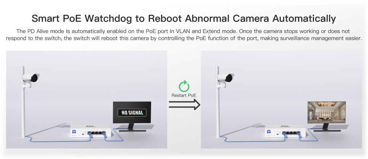 Интелигентен PoE Watchdog – Камерата е офлайн? Комутаторът я рестартира автоматично.