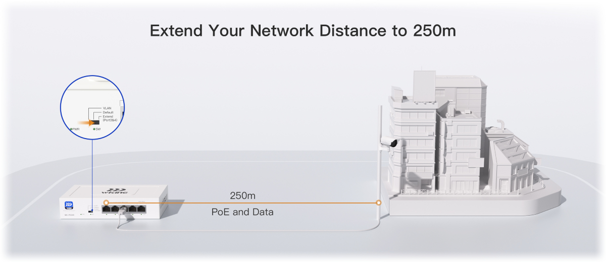 В режим Extended, комутаторът може да захранва и предоставя данни на устройство на разстояние до 250 метра (с ограничение на скоростта от 10 Mbps). Това е идеално за разполагане на камери в по-големи зони, където стандартното PoE е ограничено до 100 м.
