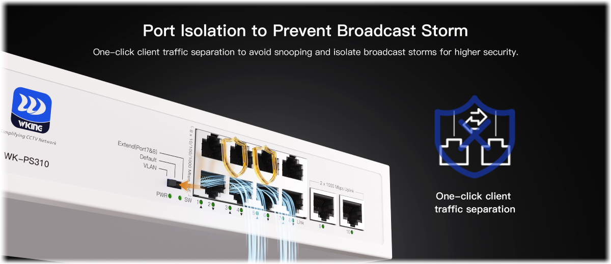 В режим VLAN, отделните PoE портове са изолирани и могат да комуникират само с uplink портовете. Това предотвратява нежелан broadcast трафик между устройствата, предпазва мрежата от претоварване, причинено от „broadcast storms“ и подобрява цялостната надеждност и сигурност на предаването.