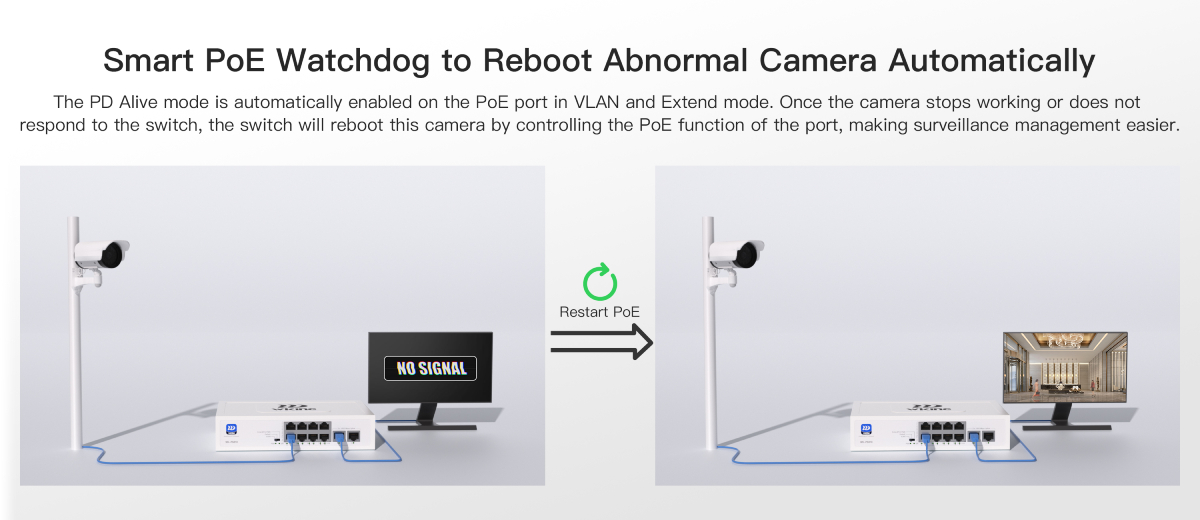 Интелигентен PoE Watchdog – Камерата е офлайн? Комутаторът я рестартира автоматично.