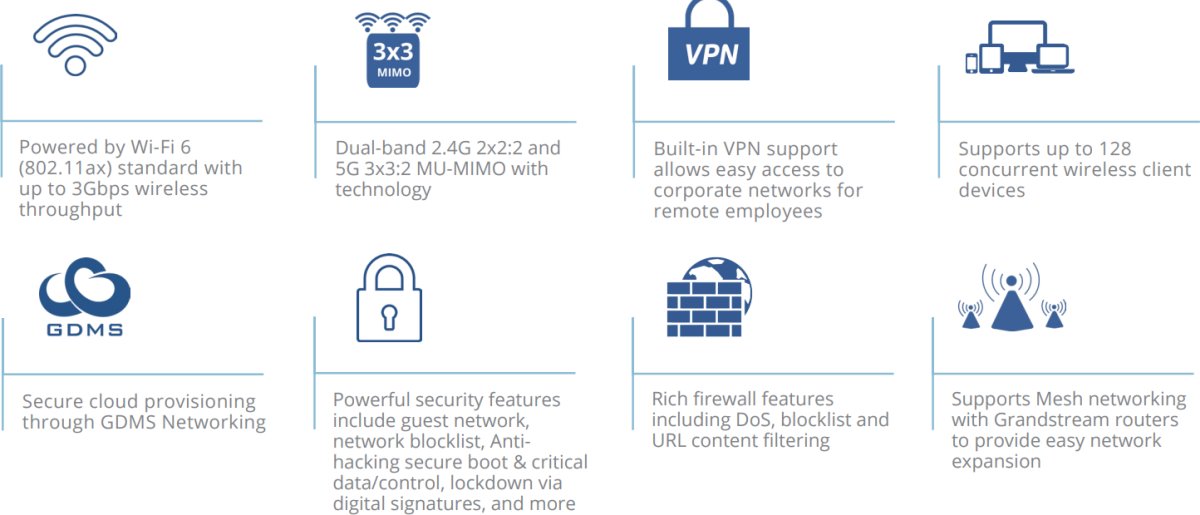 - Поддържа Mesh мрежи с Wi-Fi точки и рутери Grandstream, за да осигури лесно разширяване на мрежата