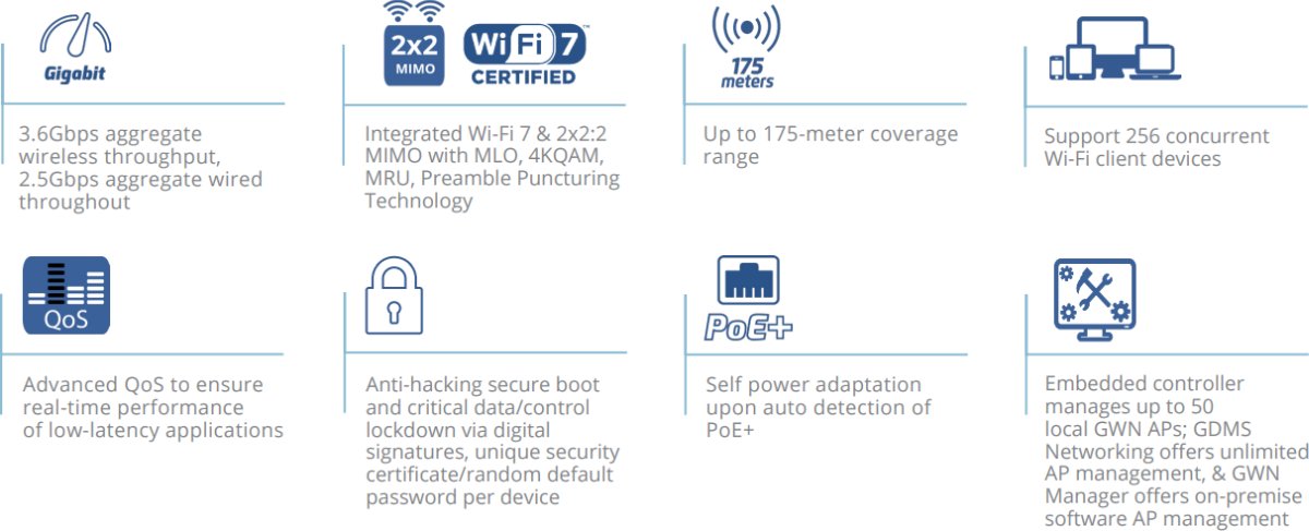 - Вграденият контролер управлява до 50 локални GWN точки за достъп; GDMS Networking предлага неограничено управление на точки за достъп, а GWN Manager предлага локално софтуерно управление на точки за достъп.