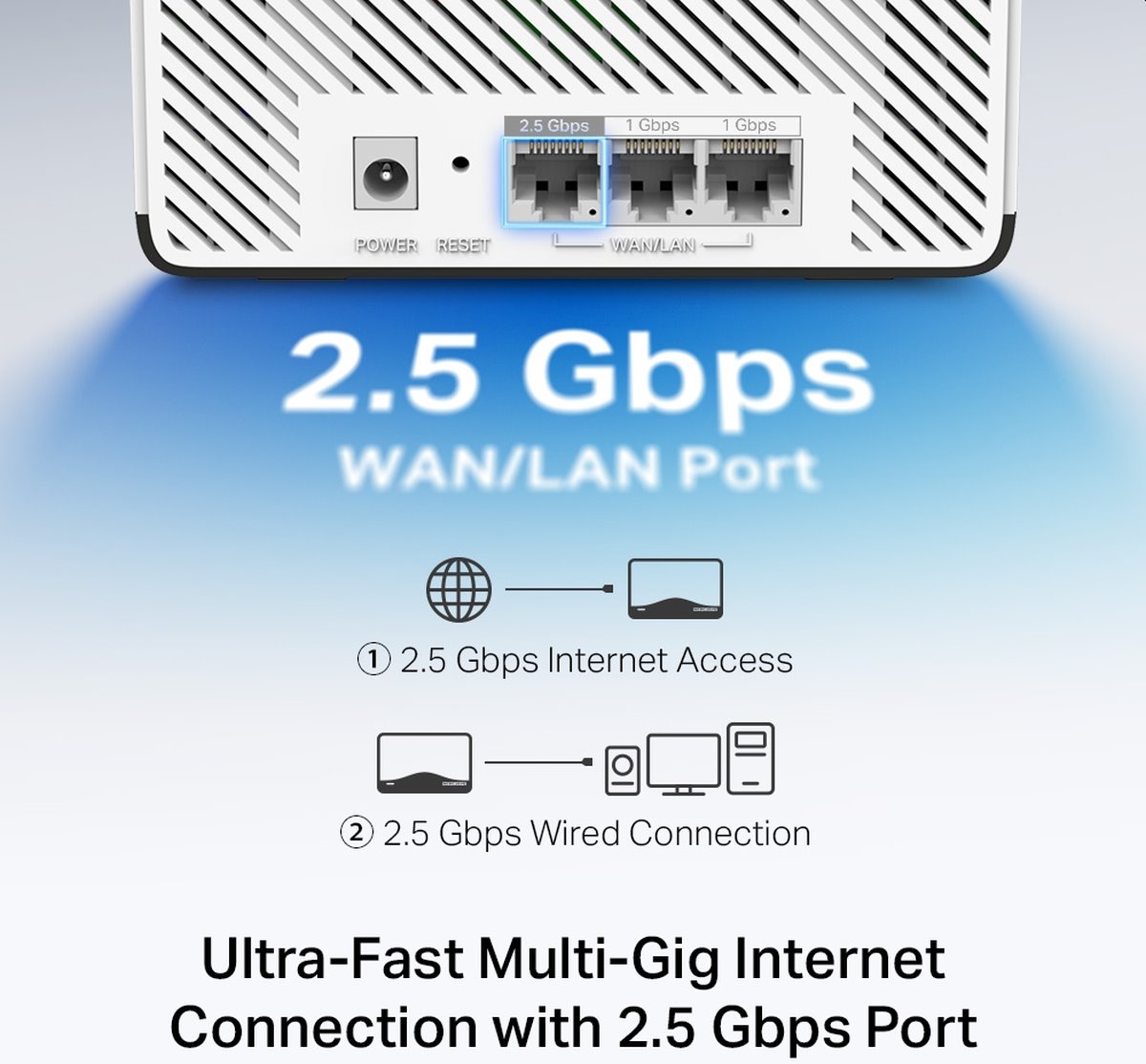 - 2.5G порт: 1× 2.5 Gbps WAN/LAN порт с автоматично разпознаване преодолява 1G бариерата, осигурявайки максимална производителност на вашите устройства.