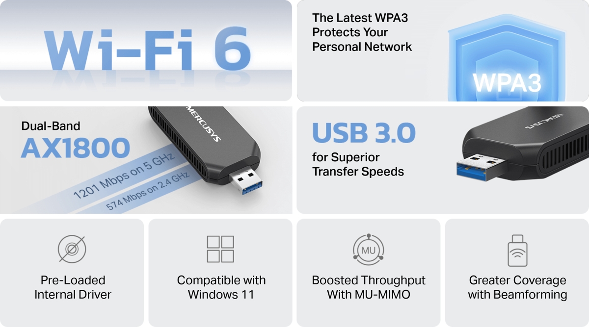 Това е автоматичен превод. Оригиналния текст може да видите тукMERCUSYS MA70XM е безжичен USB 3.0 двубандов Wi-Fi 6 адаптер , който осигурява на вашия компютър бърза и стабилна Wi-Fi свързаност.
