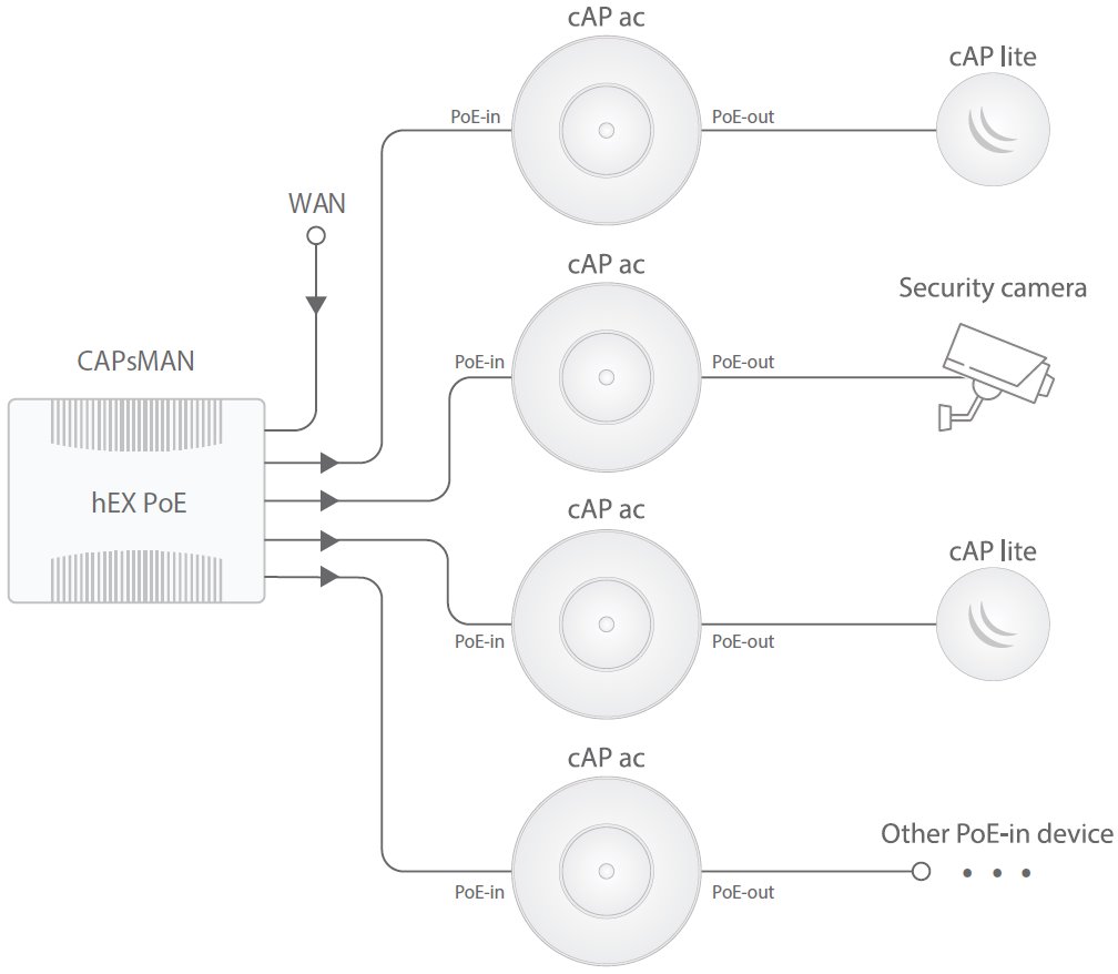 Въпреки че радиото поддържа режим на повторител, двата Ethernet порта ви дават възможност да разширите мрежата си с кабели, дори ако е необходимо PoE захранване, тъй като cAP ac поддържа 802.3af/at PoE вход на първия порт и пасивен PoE изход на втория порт.