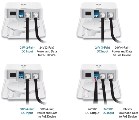 FiberPOE включва два Ethernet порта, един SFP слот и DC терминал. За захранване има 3 варианта: първият е DC терминал, вторият и третият е през RJ45 портове. Конверторът може да се захранва от 1-ви или 2-ри Ethernet порт, но само един може да предава данни + poe. И трите варианта работят в диапазон на напрежение от 16 до 50V DC.