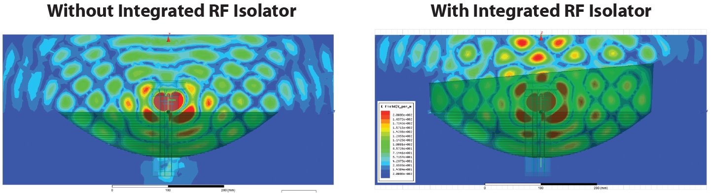Сравнете двете диаграми на близко поле и отбележете превъзходната производителност на интегрирания RF изолатор. И двата диаграма за близко поле се показват във ватове и използват линейна скала.