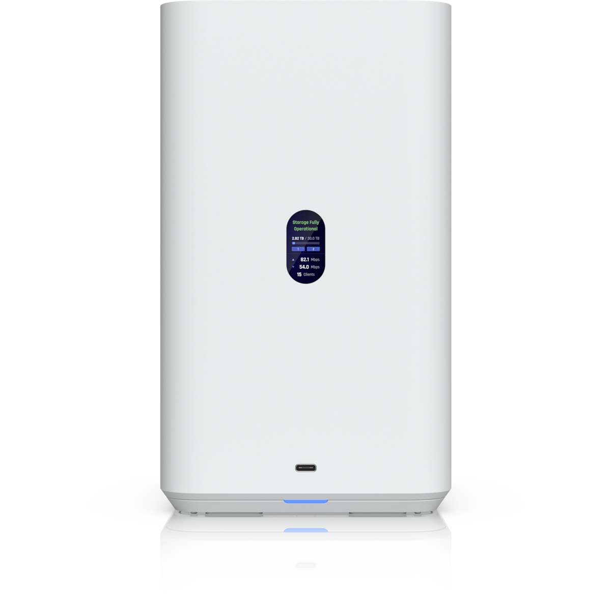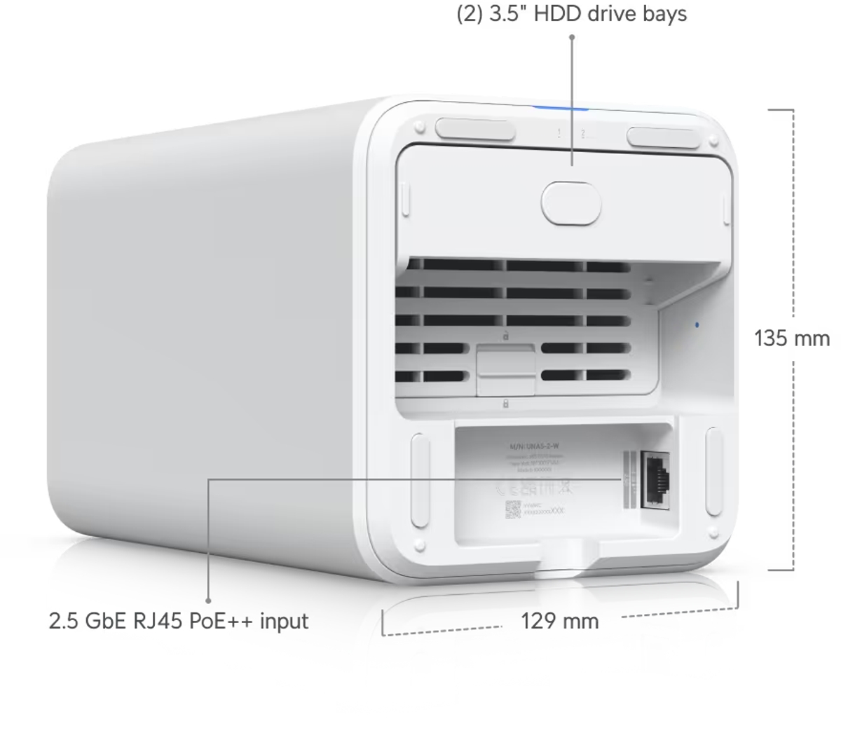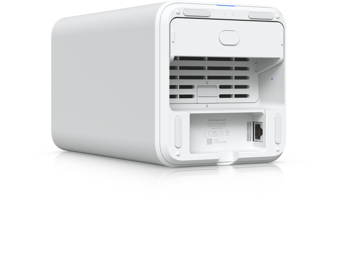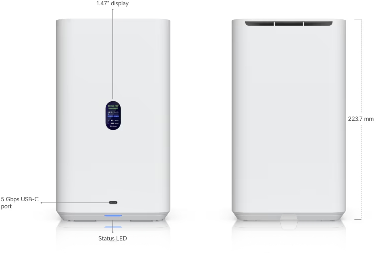 UniFi Network Attached Storage with (2) 3.5" HDD bays, 2.5 GbE RJ-45 networking, USB-C connectivity, and an included PoE++ adapter, all in a compact footprint. Powered by a quad-core ARM Cortex-A55 processor, complemented by 4 GB of RAM.