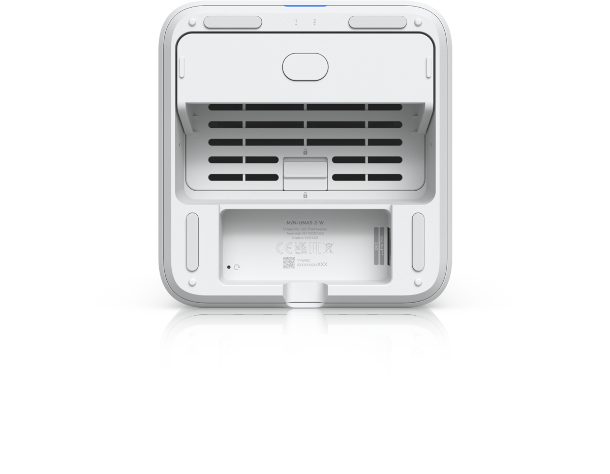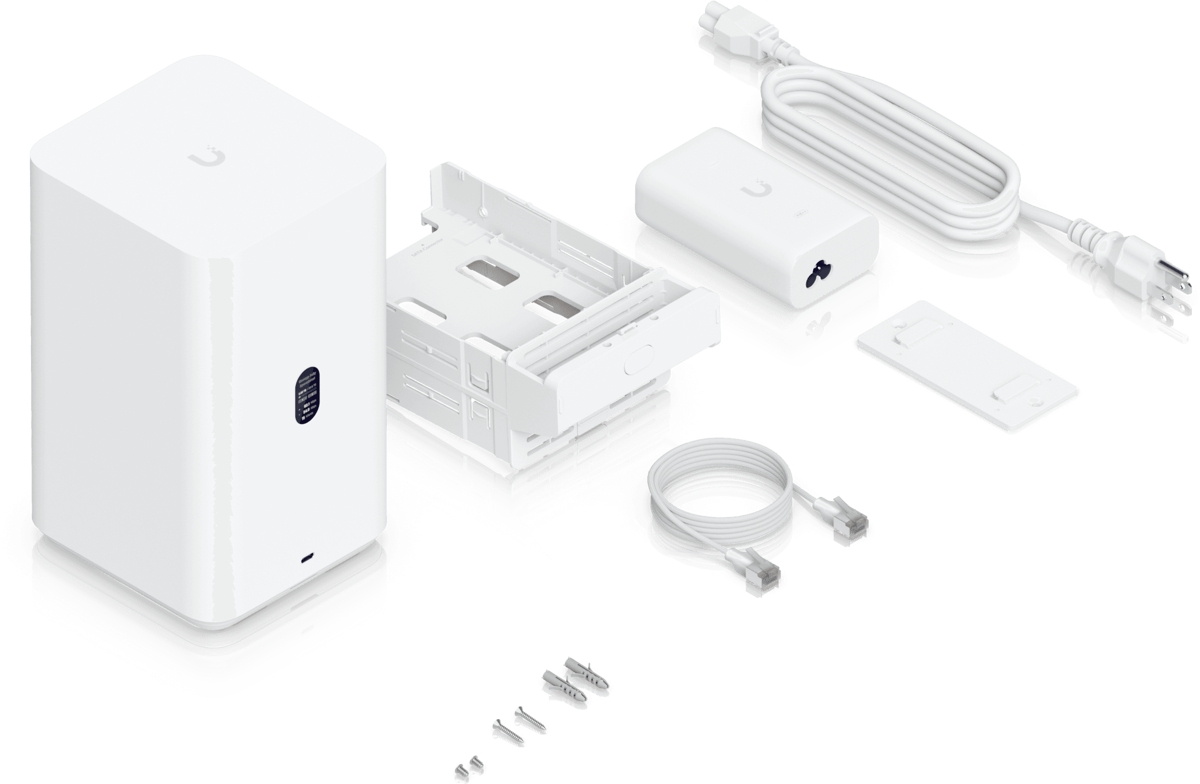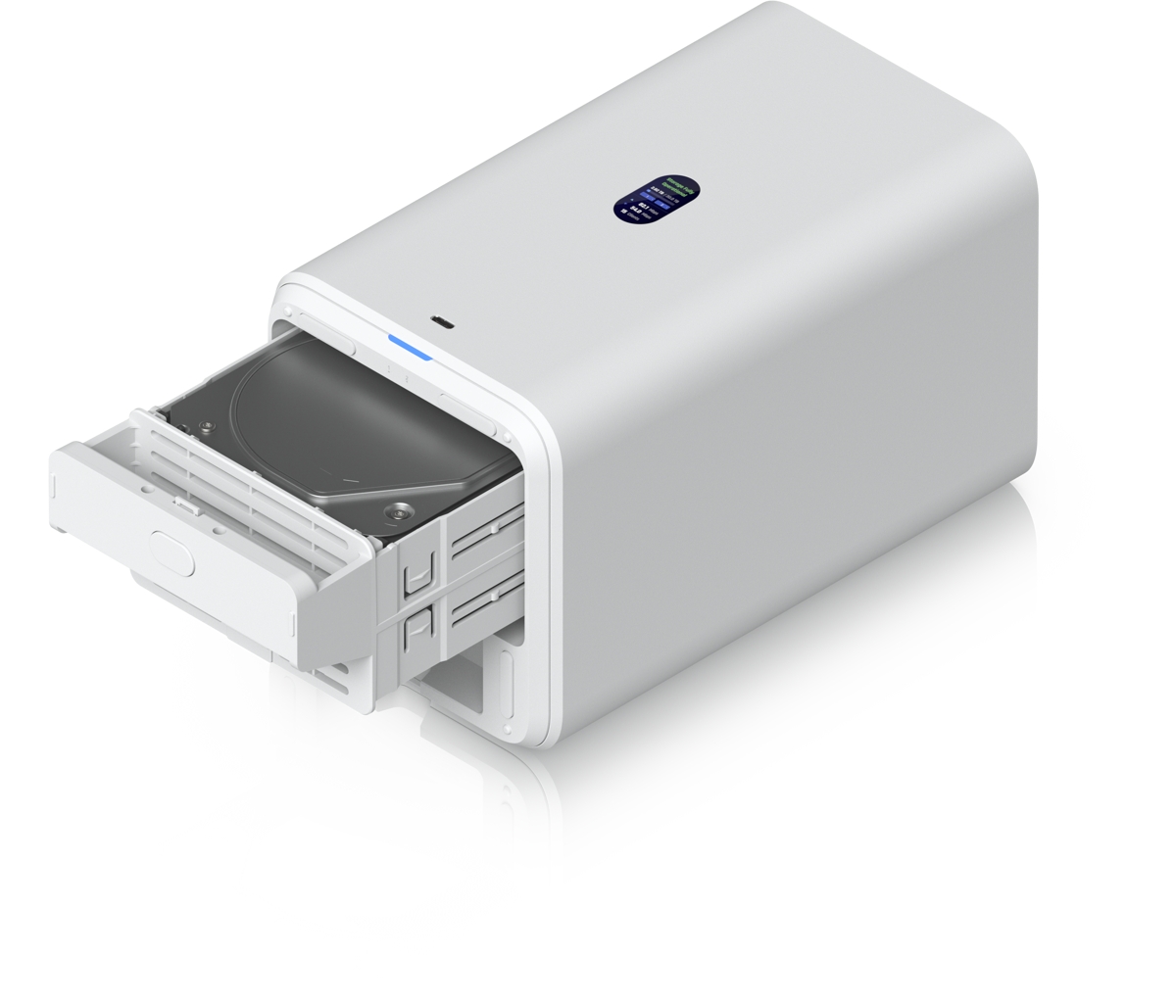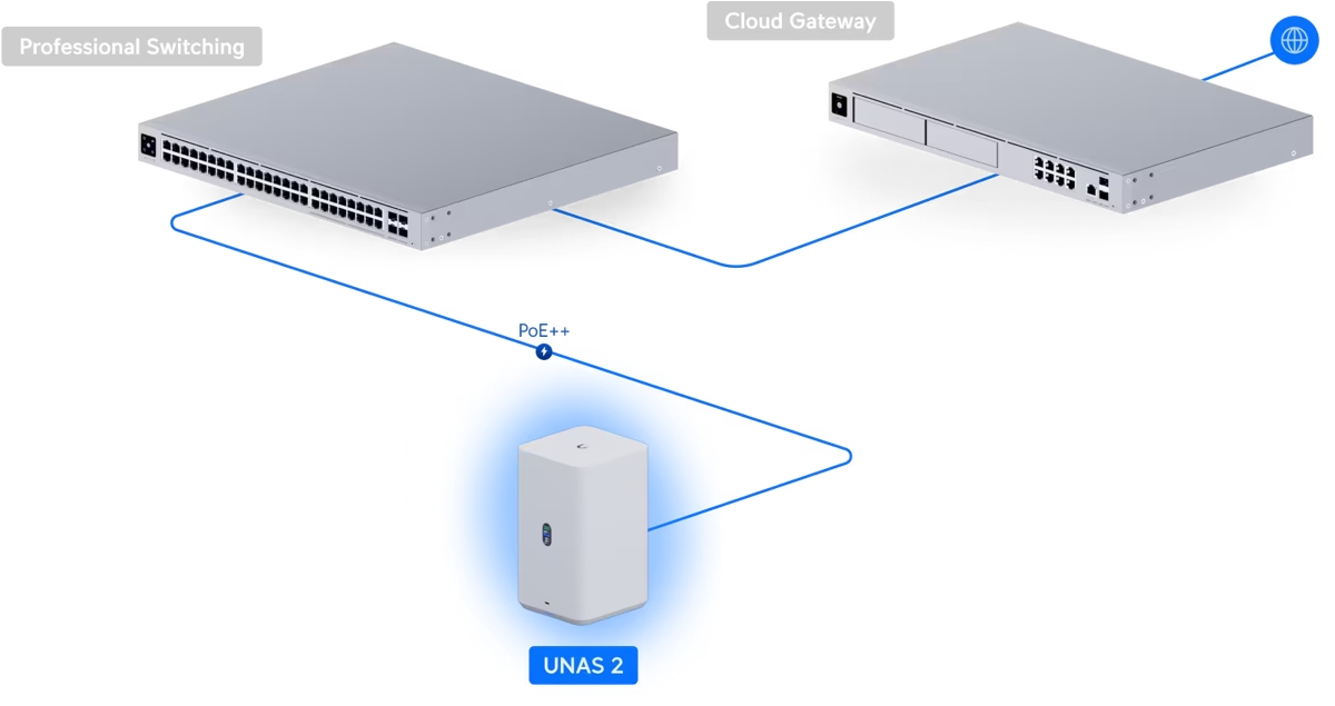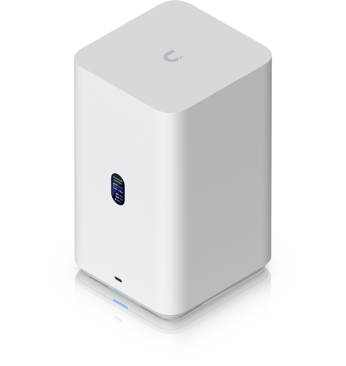 UniFi Network Attached Storage with (2) 3.5" HDD bays, 2.5 GbE RJ-45 networking, USB-C connectivity, and an included PoE++ adapter, all in a compact footprint. Powered by a quad-core ARM Cortex-A55 processor, complemented by 4 GB of RAM.