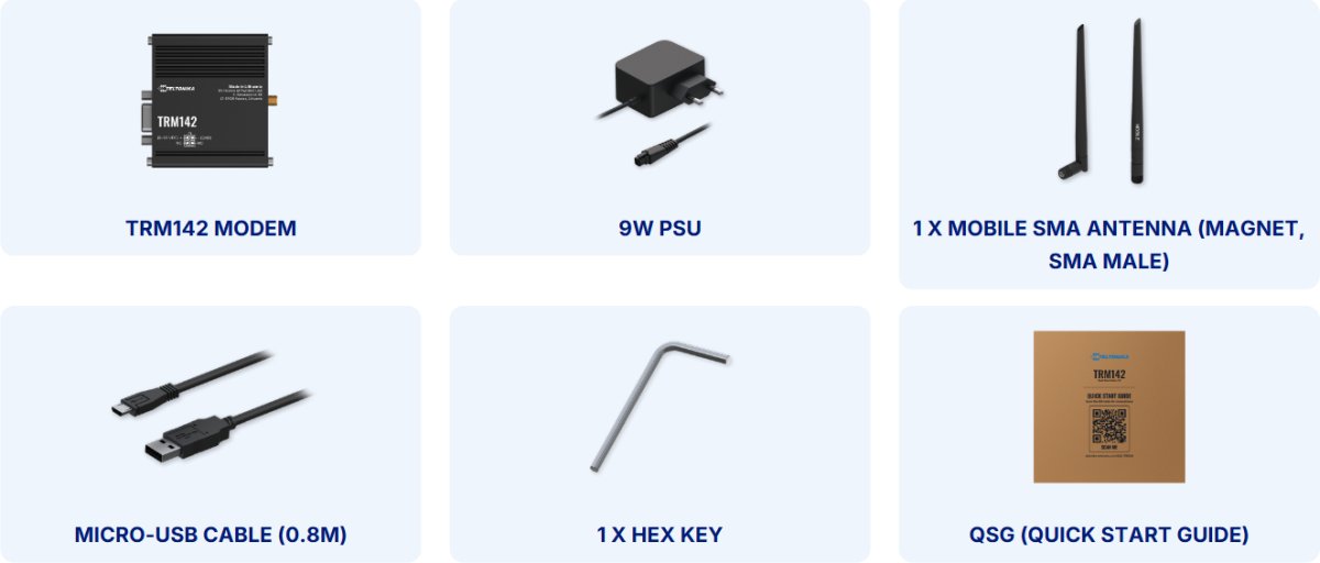 The TRM142 is a compact industrial modem designed to upgrade legacy equipment with 4G network. Equipped with LTE Cat 4 connectivity, it ensures efficient and reliable data transfer for critical applications. The device is designed to modernise and provide 4G LTE communication for legacy devices such as alarm systems, legacy controllers and similar equipment which uses serial interfaces for external communication.