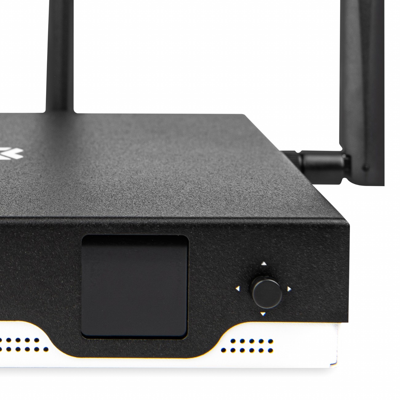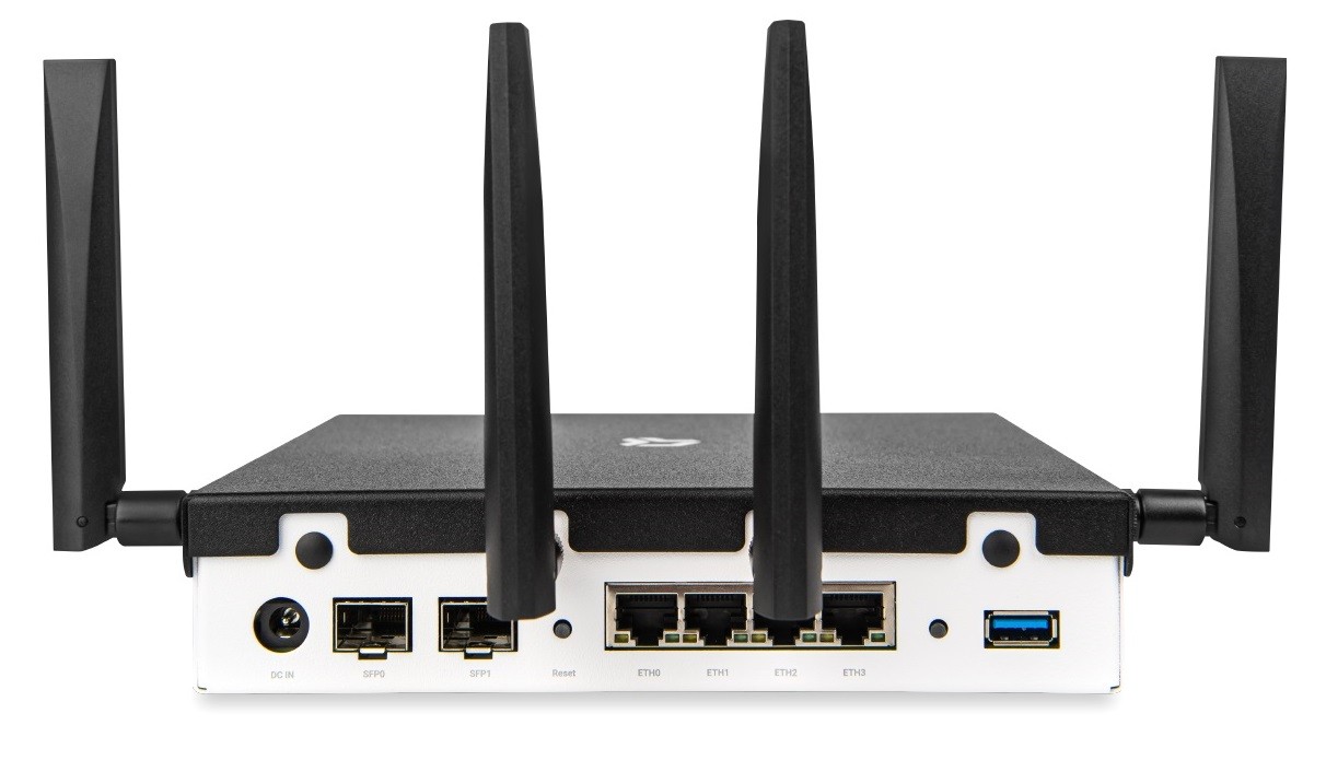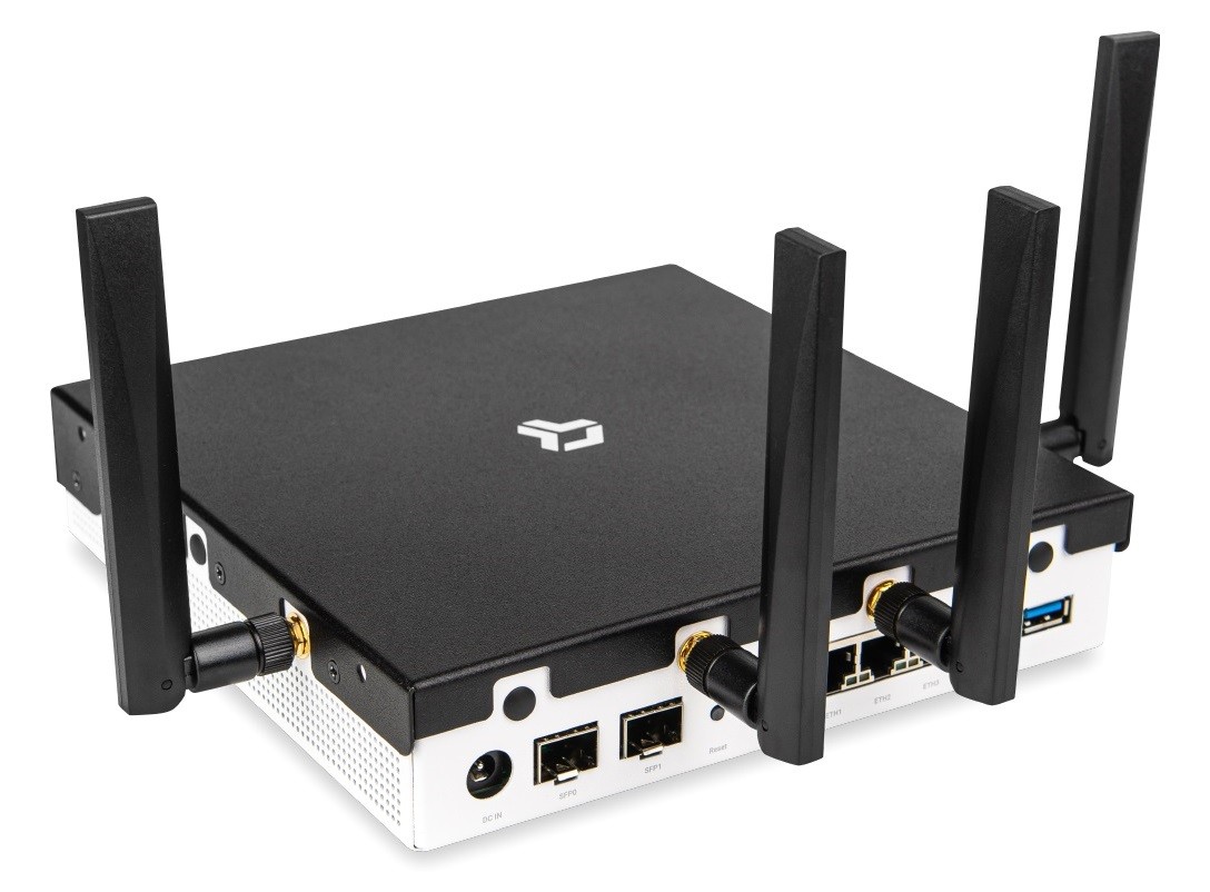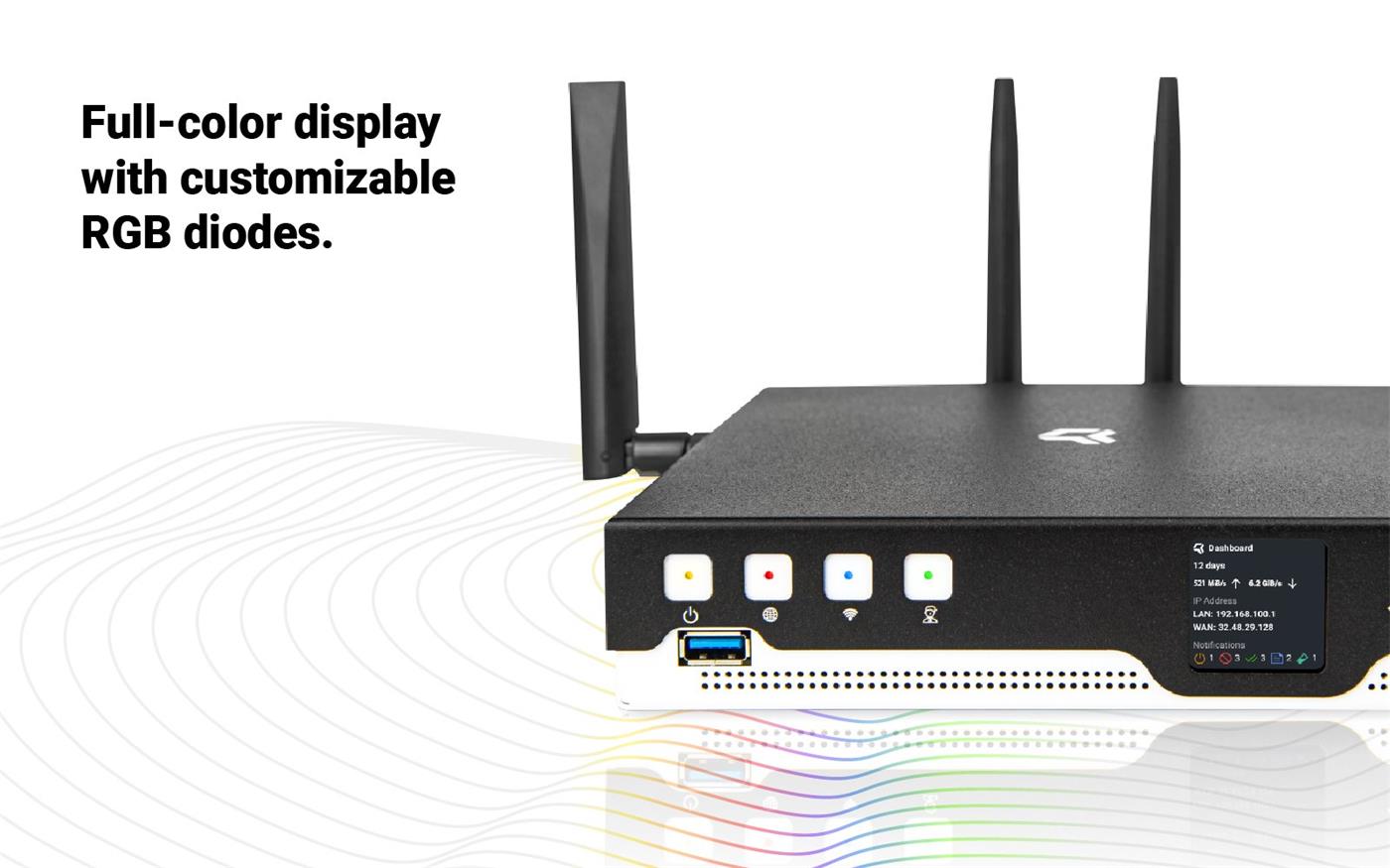 High-performance 10 Gbps, secure, open-source router with Wi-Fi 7, display, and extensive customization options. The WAN port is a (1) 10/100/1000/2500/10000 Mbps SFP+ port or (1) 10/100/1000/2500 Mbps RJ45 port, and the local network includes (3) 10/100/1000/2500 Mbps RJ45 ports and (1) 10/100/1000/2500/10000 Mbps SFP+ port.