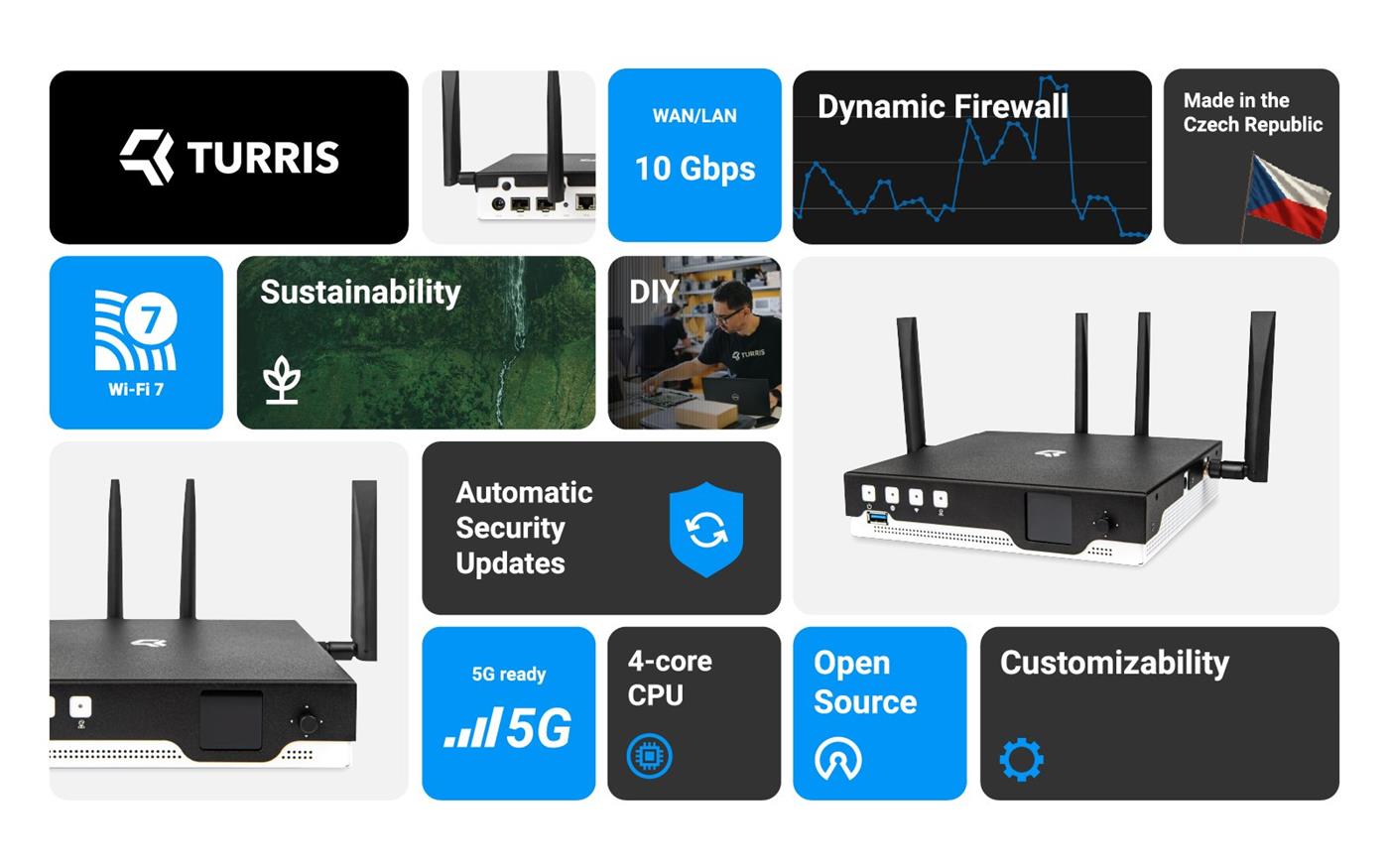 Turris Omnia NG is a next-generation secure and high-performance router, ideal for households, small and medium-sized businesses, and tech enthusiasts. It offers cutting-edge technologies including Wi-Fi 7, 10 Gbps WAN/LAN, and support for Linux containers – virtualization. Thanks to its secure default configuration, automatic updates, and dynamic firewall, your network is protected against external threats.