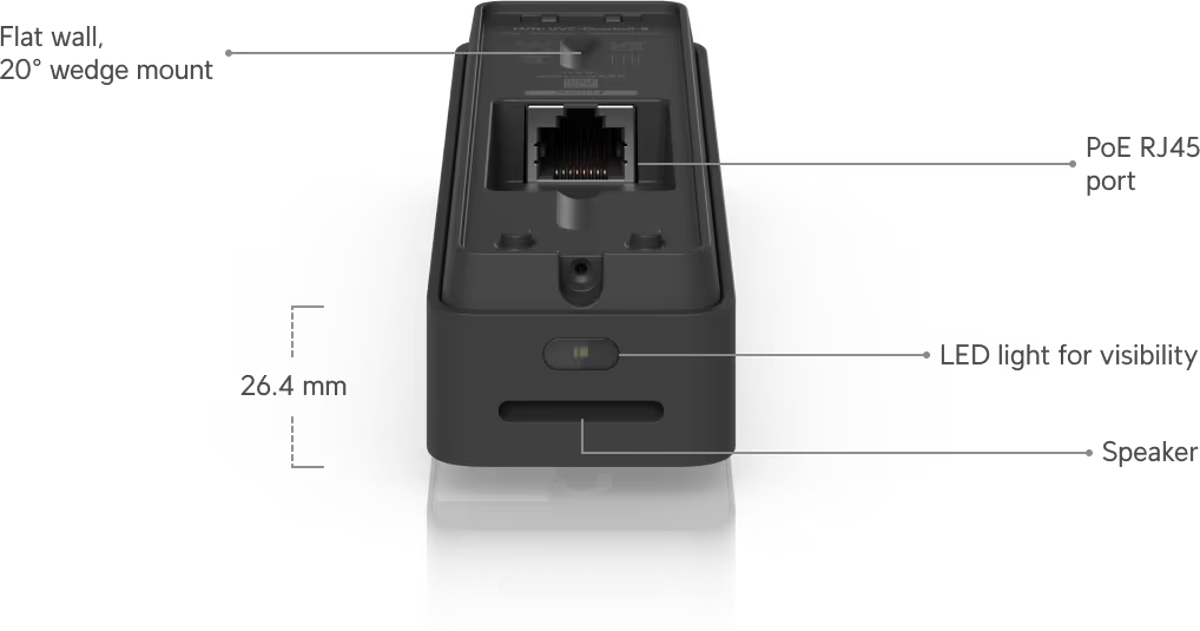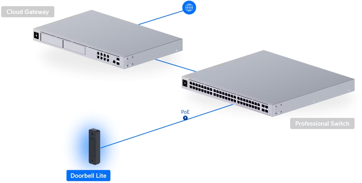 The Ubiquiti Doorbell Lite is a compact UniFi Protect video doorbell featuring a 5MP camera, 95.8° field of view, IR illumination for night vision up to 5m, a weather-resistant enclosure, built-in microphone and speaker for two-way audio communication. Power and network connectivity are provided via (1) 10/100Mbps PoE-In port for connection to a UniFi Protect system.