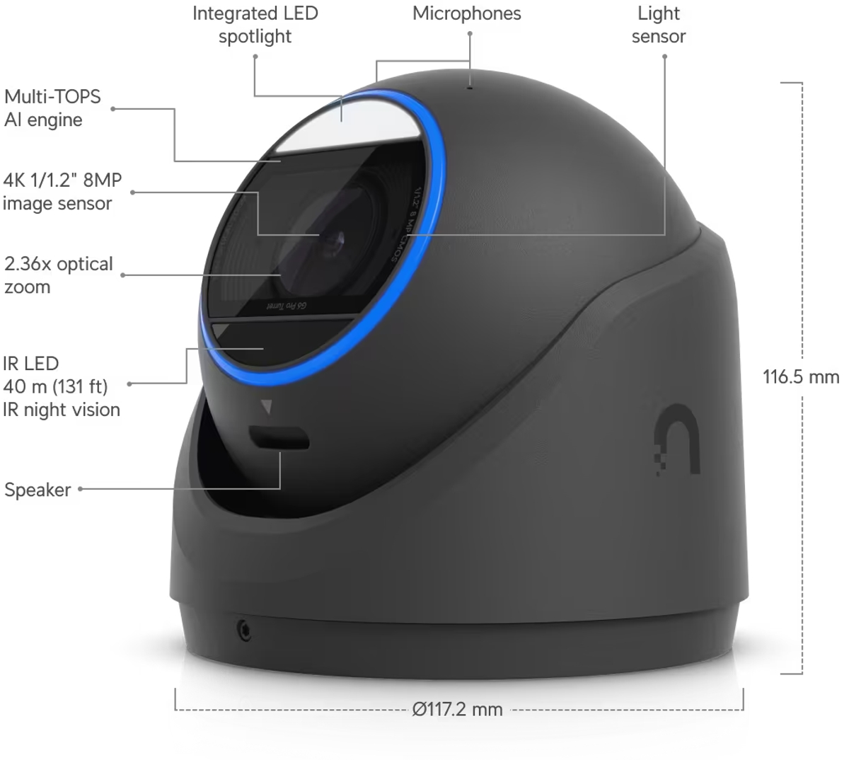 Ubiquiti UniFi IP turret hybrid camera UVC-G6-Pro-Turret-B features an 8MP sensor (3840 x 2160 px) at 30fps, a varifocal lens (5.85mm-13.8mm), combined IR/white light illumination for night vision up to 40m, IP66 and IK4 protection and built-in microphones. The camera connects to the network via 1Gbit LAN with PoE+ support and a maximum power consumption of 15W.