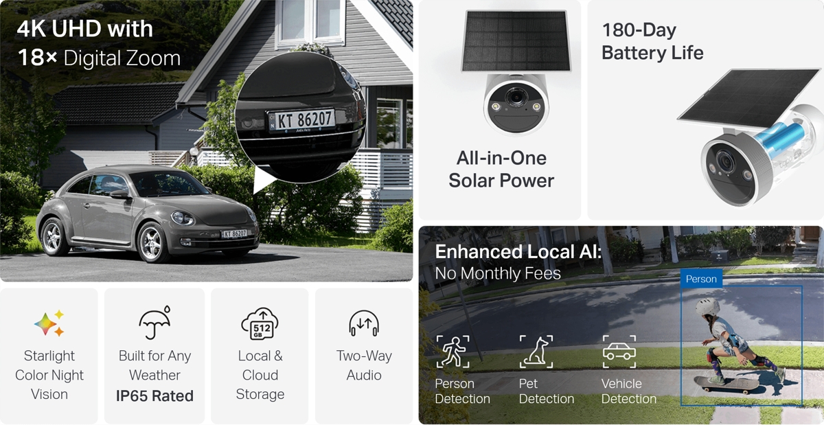 - Advanced AI detection - filters out false alerts and reliably detects people and vehicles