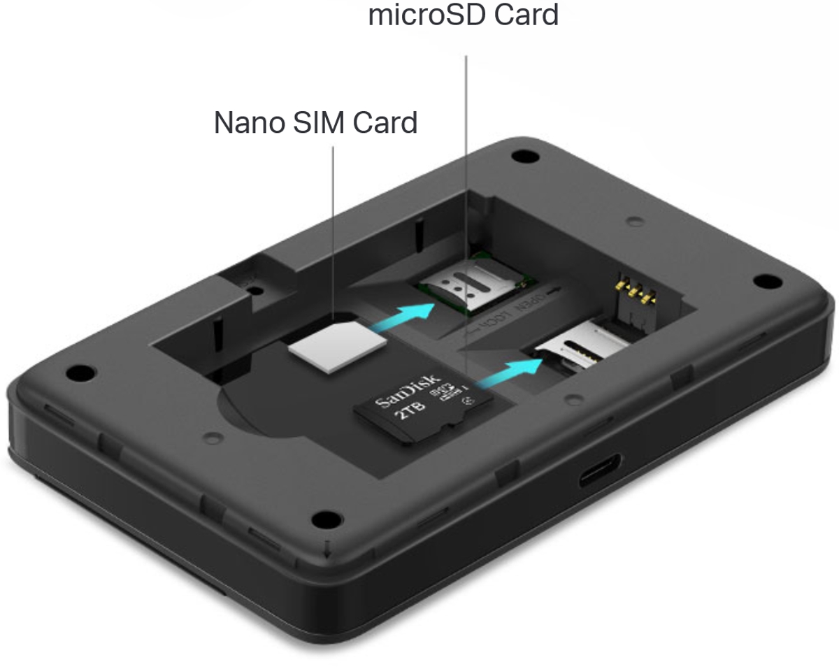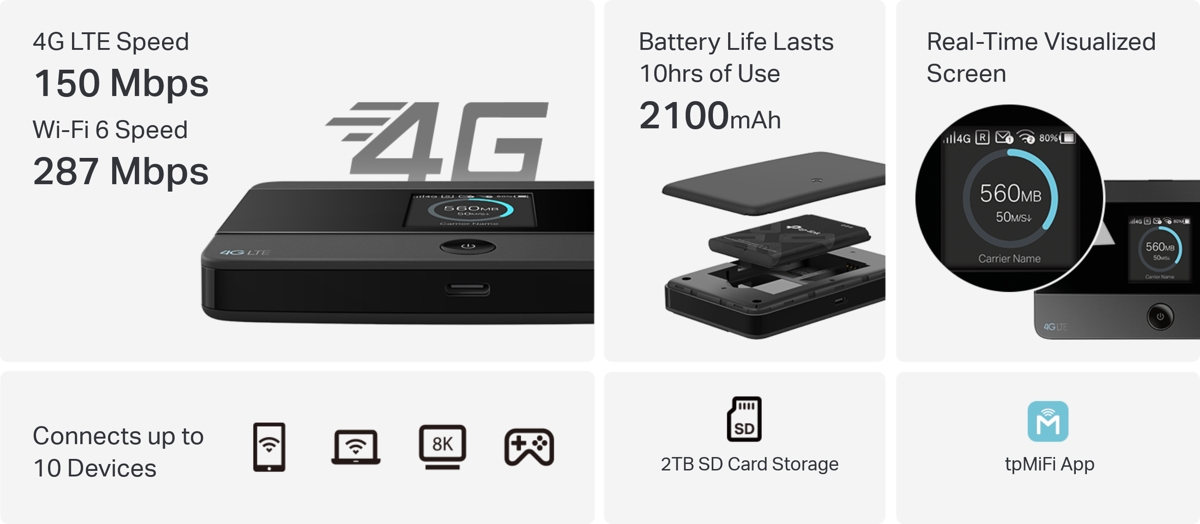 On a single charge, it can operate for up to 10 hours. Using the tpMiFi app, you can easily manage the device and also take advantage of the microSD card slot (up to 2TB) to create portable storage. Additionally, the intuitive display shows all important information at a glance, making it easy to monitor data usage and avoid exceeding your monthly data limit.