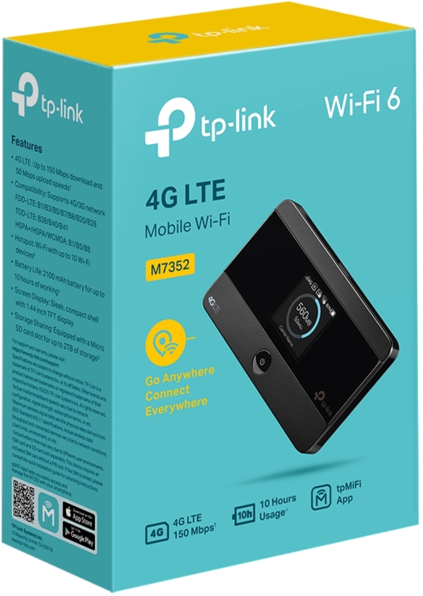 The TP-Link M7352 is a 4G LTE router that, thanks to its compact size and 2100mAh battery, is ideal for use on the go. After inserting a SIM card, it creates a Wi-Fi 6 hotspot with download speeds of up to 150Mbps and upload speeds of up to 50Mbps, supporting up to 10 users.