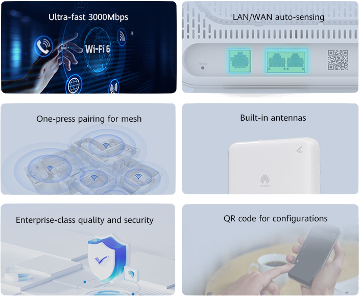 The Huawei eKitOptiX FG630 is a wireless dual-band Wi-Fi 6 router that is perfectly suited for combination with ONT units in bridge mode. It works simultaneously in the 2.4GHz and 5GHz bands, delivering a maximum total throughput of up to 2.98Gbps and is equipped with (3) 1Gbit LAN/WAN ports. The router is Mesh-compatible and can be wirelessly paired with other Huawei products to create a complete home network with a single SSID, allowing seamless roaming.
