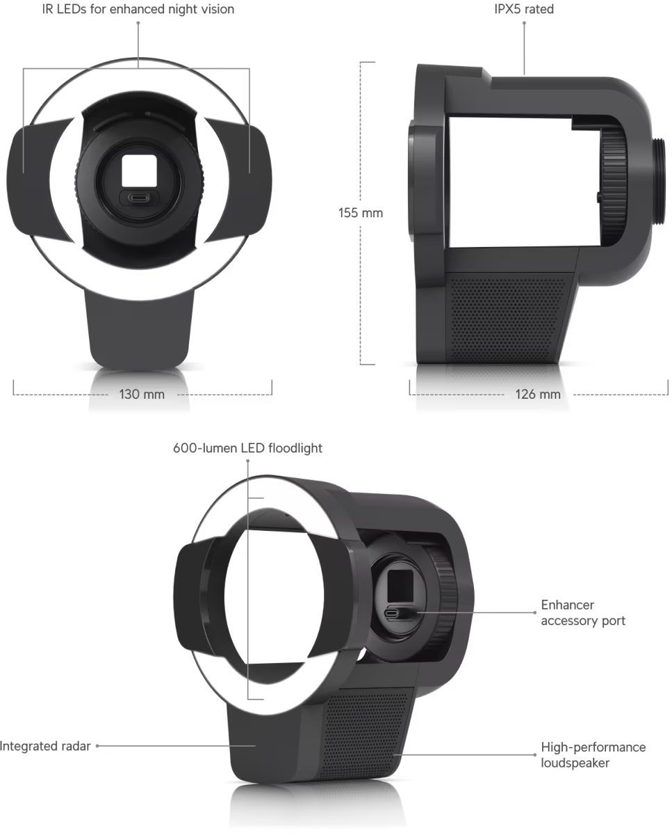 The Ubiquiti UACC-Pro-Bullet-Enhancer-B is an IPX5 rated accessory designed to enhance cameras with up to 60m IR illumination (40m for AI Pro), 600 lumen LED floodlight, speaker and a radar motion detector with a detection range of up to 20m for people and 35m for vehicles.