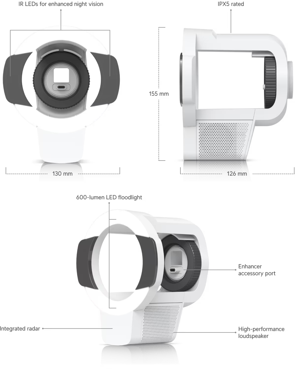 The Ubiquiti UACC-Pro-Bullet-Enhancer-W is an IPX5 rated accessory designed to enhance cameras with up to 60m IR illumination (40m for AI Pro), 600 lumen LED floodlight, speaker and a radar motion detector with a detection range of up to 20m for people and 35m for vehicles.