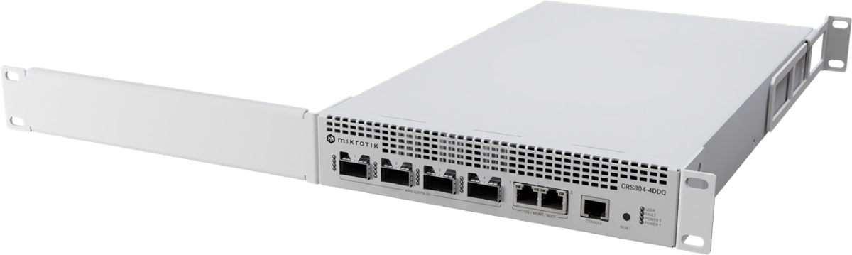 The MikroTik CRS804 DDQ is a reliable and compact 400G Cloud Router Switch designed to interconnect network devices with very high throughput demands, such as in AI and GPU clusters. It is equipped with (4) 40G/50G/100G/200G/400G QSFP-DD ports, (2) 1G/2.5G/5G/10G ports and (1) console port. The QSFP-DD ports support breakout mode, allowing the bandwidth to be split into 1G/2.5G/5G/10G/25G/50G speeds.