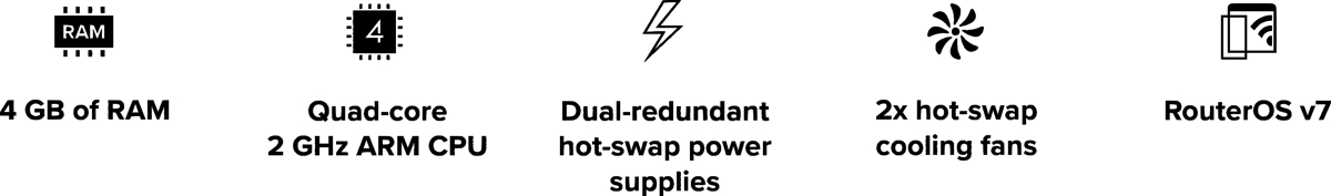 To ensure high availability, the device features (2) redundant hot-swap power supplies and (2) hot-swap cooling fans. In the event of a power supply or fan failure, the faulty module can be replaced without shutting down the switch. The unit is powered by a high-performance quad-core processor and is equipped with 4GB of RAM.