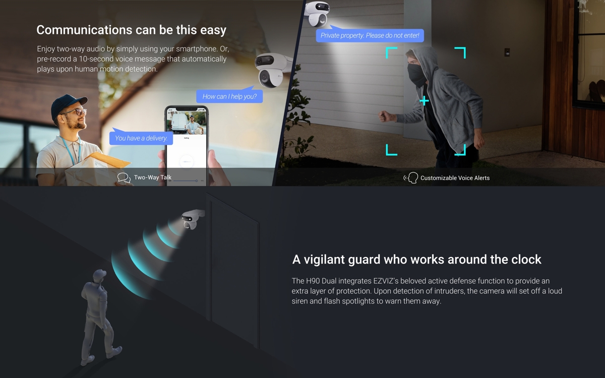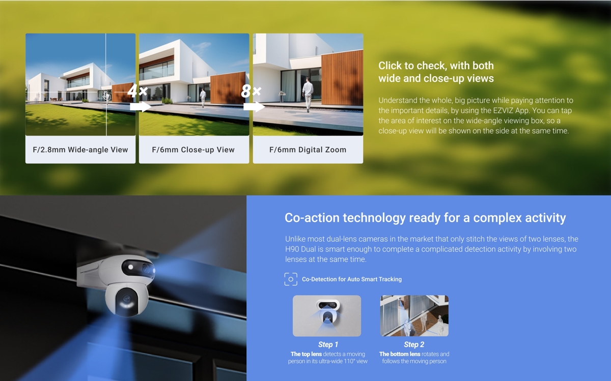 The Ezviz IP PT dual Wi-Fi camera H90 Dual features (2) 4MP sensors (2560 x 1440 px), IP65 weather protection, combined IR/white light illumination for night vision up to 30m + flasher (strobe light and audible alarm) and two-way audio. The Bullet sensor has a fixed 2.8mm (96°) lens and the PTZ sensor has a fixed 6mm (52°) lens. The camera can be connected to the network via Wi-Fi 4 or the 10/100Mbps port.