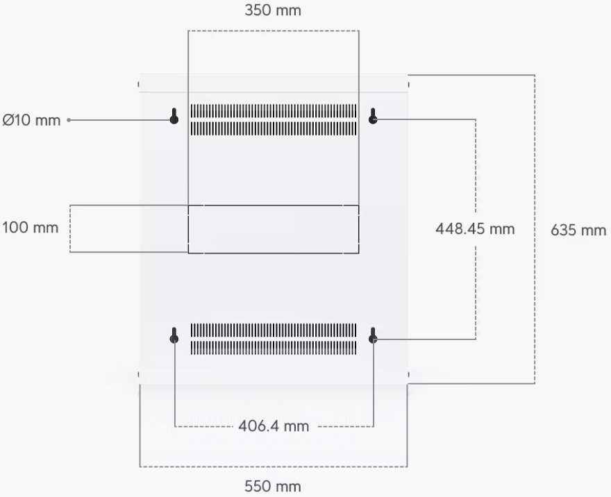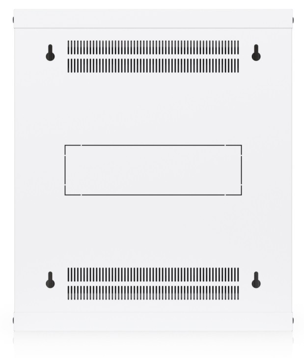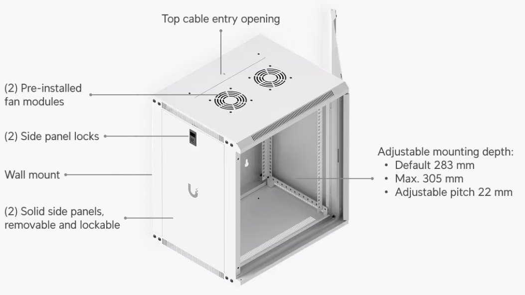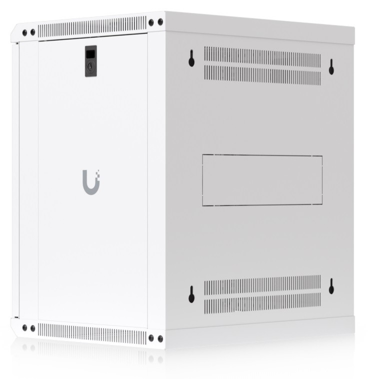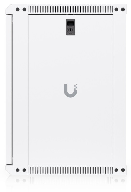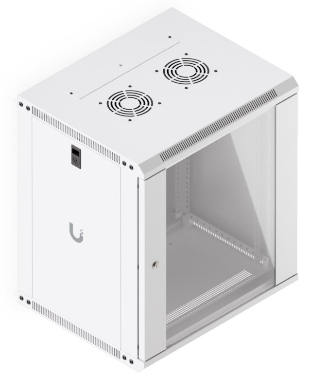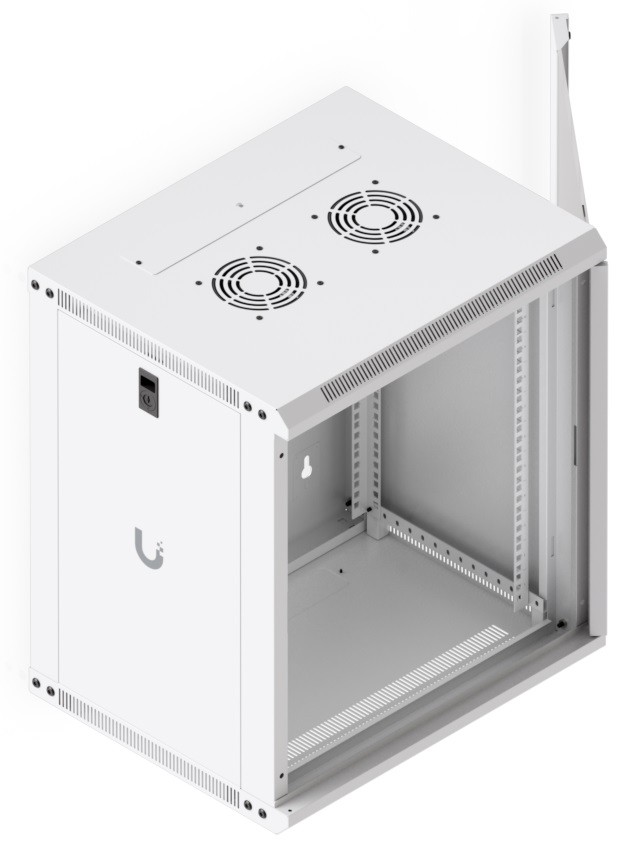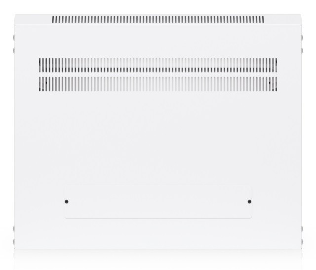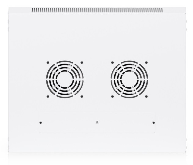 To ensure efficient cooling of active components, the rack cabinet is equipped with a pair of fans, keeping total noise levels below 50 dB(A). If you need to back up active devices using, for example, batteries, you will appreciate its above-standard load capacity of 50 kg. The enclosure features an elegant white finish with a powder-coated surface, and the Ubiquiti logo is present on the side panels. Cable entry points covered with blanking plates are available on the bottom, top, and rear sides of the rack cabinet.