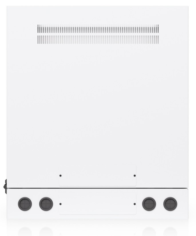 To ensure efficient cooling of active components, the rack is equipped with a pair of fans, keeping total noise levels below 50 dB(A). If you need to back up active devices using, for example, batteries, you will appreciate its above-standard load capacity of 80 kg. The enclosure features an elegant white finish with a powder-coated surface, and the Ubiquiti logo is present on the side panels. Cable entry points covered with blanking plates are available on the bottom, top, and rear sides of the rack.