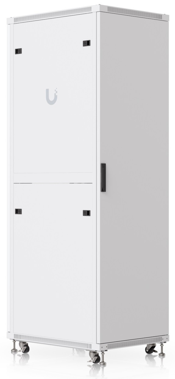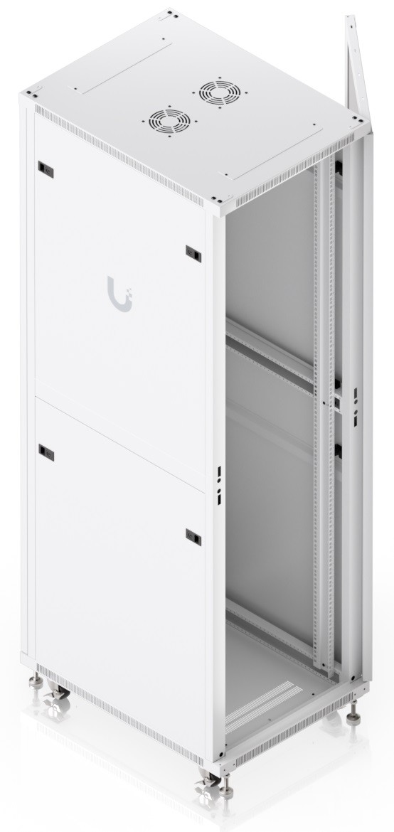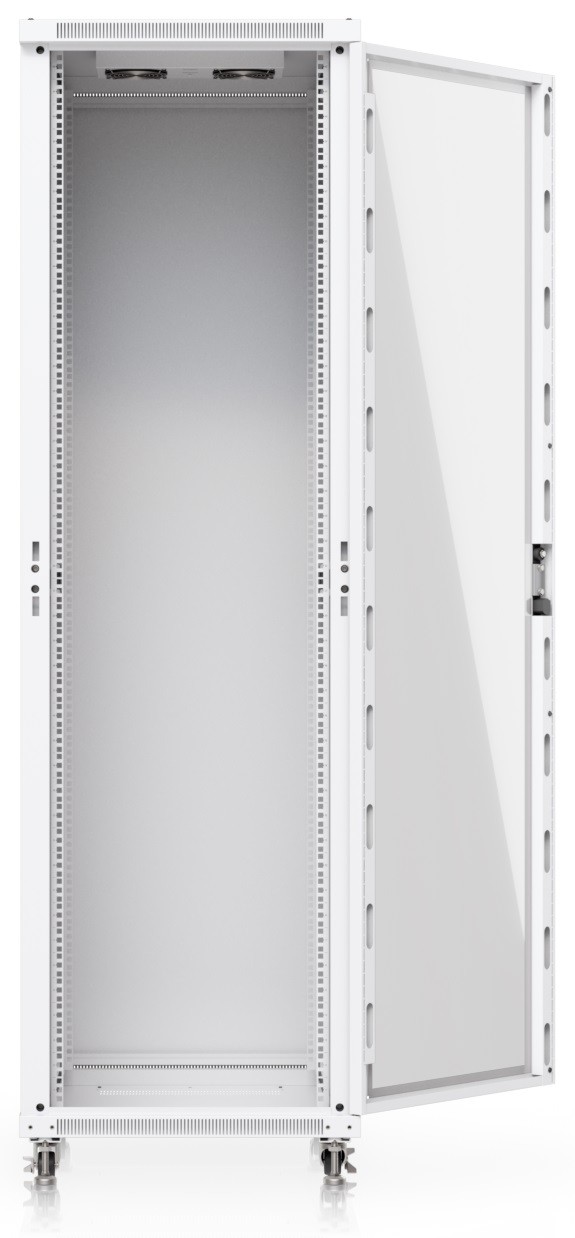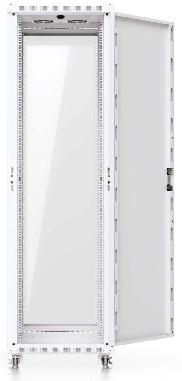 Ubiquiti UACC-Rack-42U-800-G is a 19" floor-standing rack in 42U size, delivered fully assembled and equipped with a glass front door panel, which — just like the split removable side panels — can be locked to prevent unauthorized access. The door is factory-set to a left-hand orientation with the option to reverse it. With a depth of 1000 mm, the rack allows the installation of networking devices up to 682 mm deep.