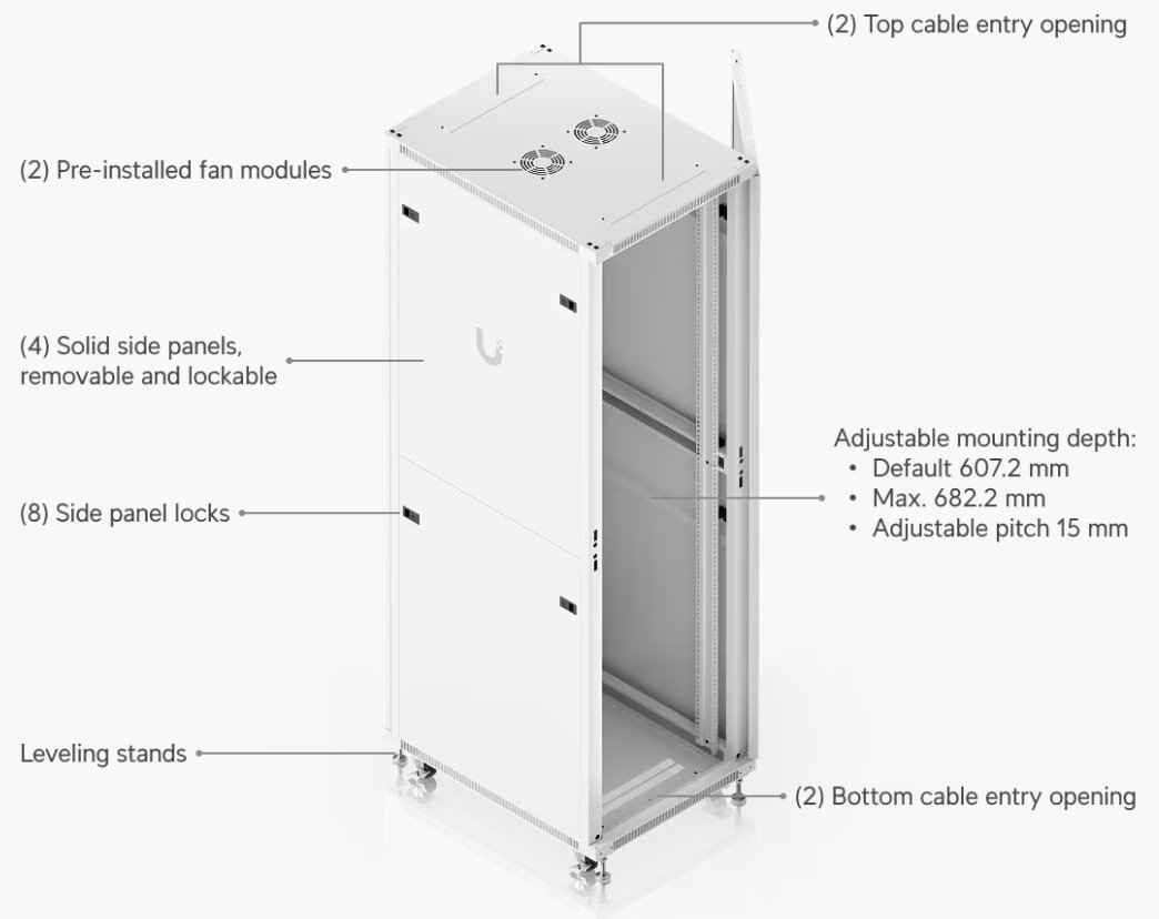To ensure efficient cooling of active components, the rack is equipped with four fans. The static load capacity is 800 kg, and the rolling load capacity is up to 320 kg. The enclosure features an elegant white finish with a powder-coated surface, and the Ubiquiti logo is present on the side panels. Cable entry points covered with blanking plates are available on the bottom, top, and rear sides of the rack.
