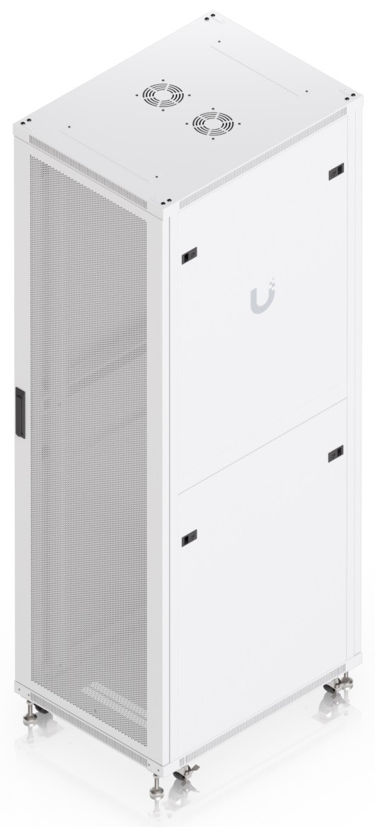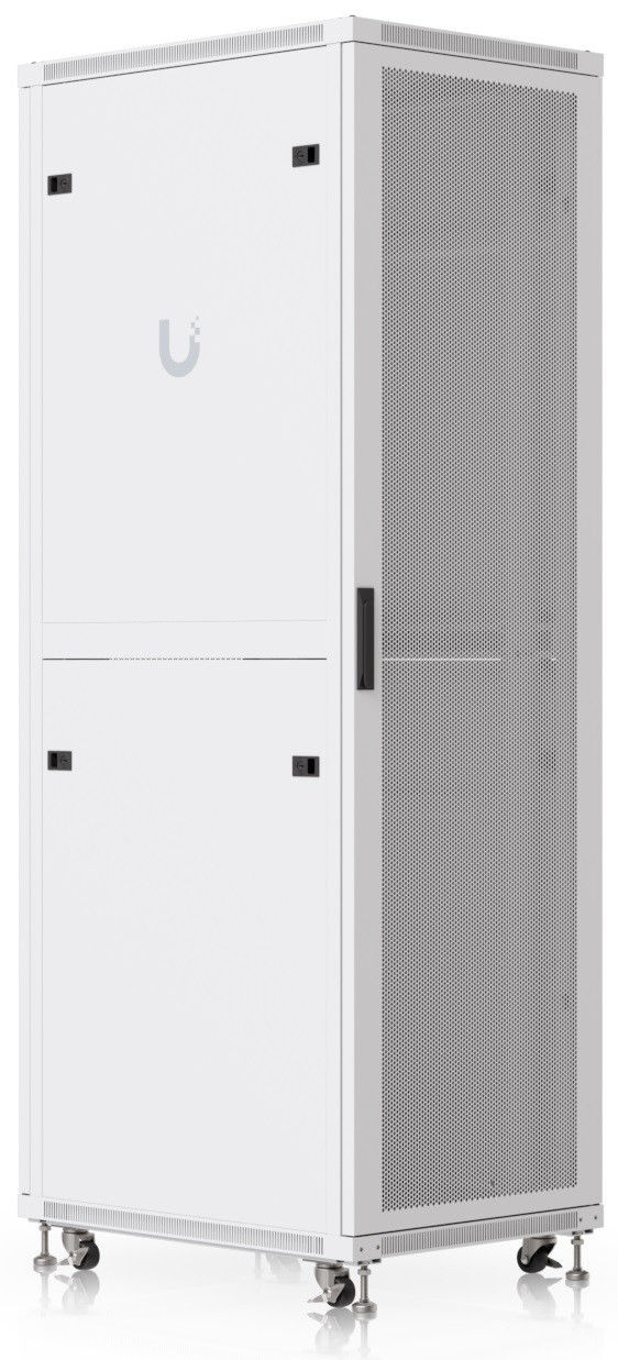 Ubiquiti UACC-Rack-42U-800-P is a 19" floor-standing rack in 42U size, delivered fully assembled and equipped with a perforated front and back door panel, which — just like the split removable side panels — can be locked to prevent unauthorized access. The door is factory-set to a left-hand orientation with the option to reverse it. With a depth of 1000 mm, the rack allows the installation of networking devices up to 682 mm deep.