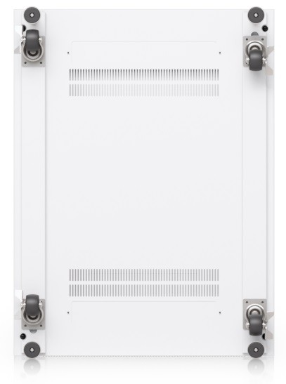 To ensure efficient cooling of active components, the rack is equipped with four fans. The static load capacity is 800 kg, and the rolling load capacity is up to 320 kg. The enclosure features an elegant white finish with a powder-coated surface, and the Ubiquiti logo is present on the side panels. Cable entry points covered with blanking plates are available on the bottom, top, and rear sides of the rack.