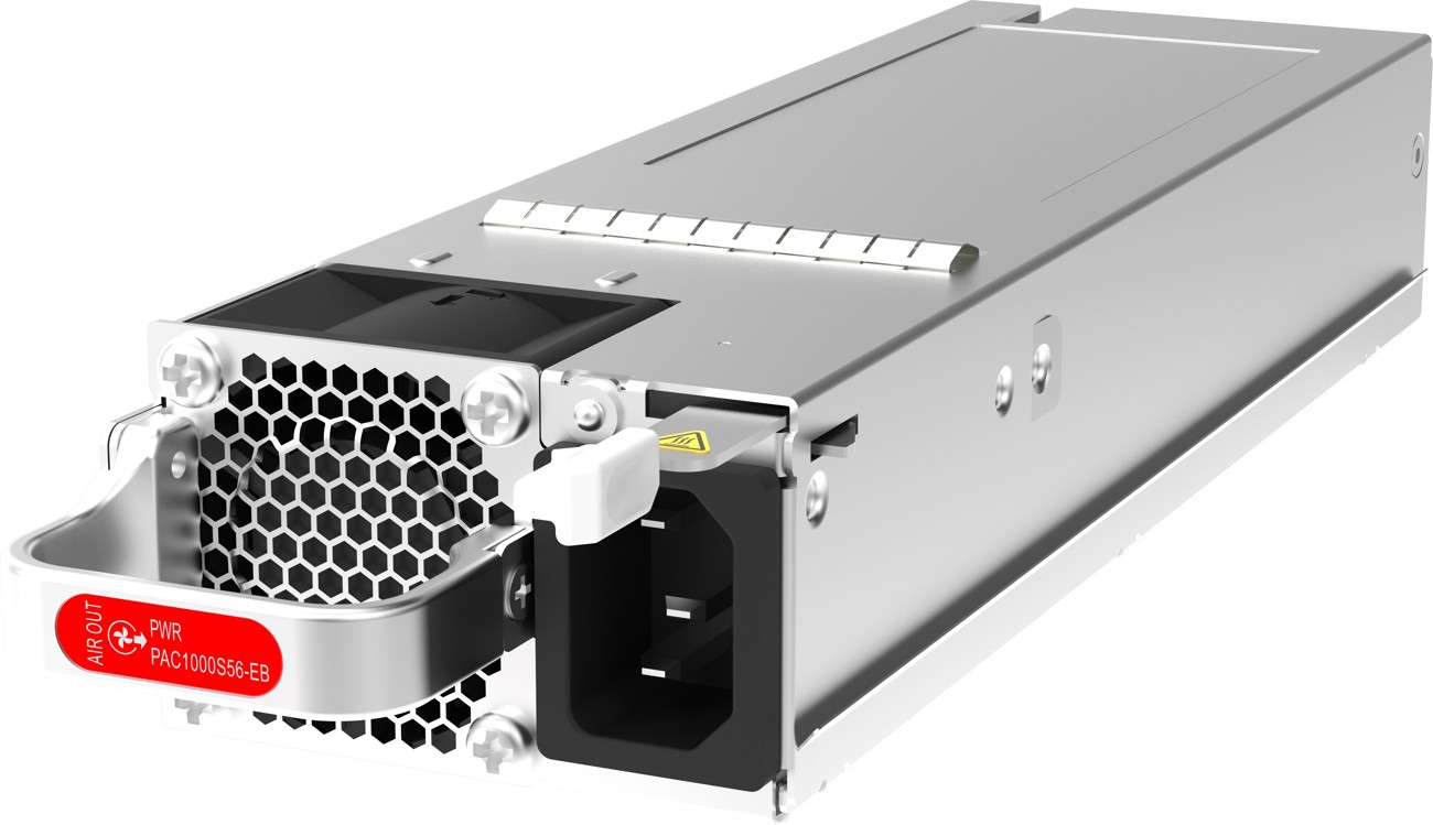 Huawei PAC1000S56-EB is a power supply with a wide range of input power options: 100–130 V AC, 200–240 V AC, or 190–290 V DC. It comes with a built-in fan and delivers output power of up to 1000 W, with hot-swap capability.