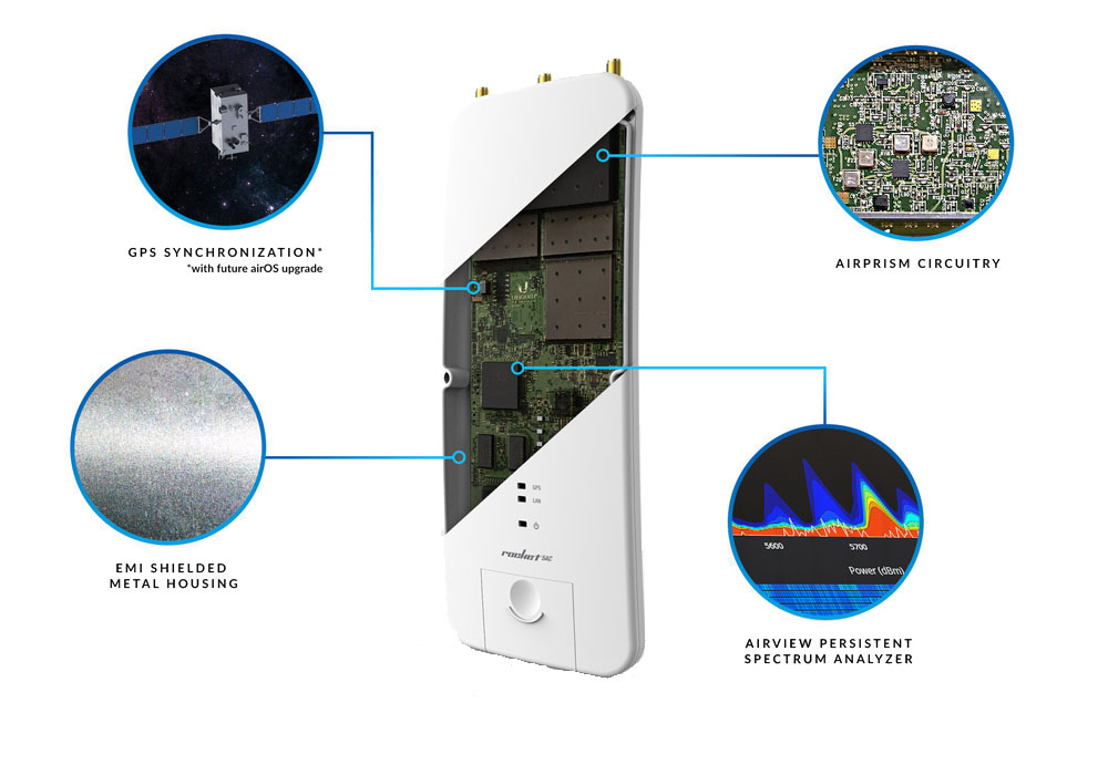 Патентованата технология airPrism на Ubiquiti осигурява революционна радиоселективност при нелицензирана безжична честотна лента. Технологията airPrism изолира сигналите в работния канал, за да увеличи капацитета и пропускателната способност при внедряване на съвместно местоположение.