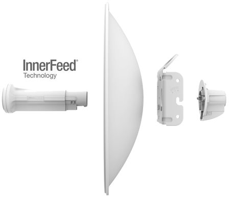 Технологията InnerFeed® на Ubiquiti интегрира радиото във фийдхорна на антената, така че няма нужда от кабели за свързване на радиото към антената. Това подобрява производителността, тъй като елиминира кабелните загуби.