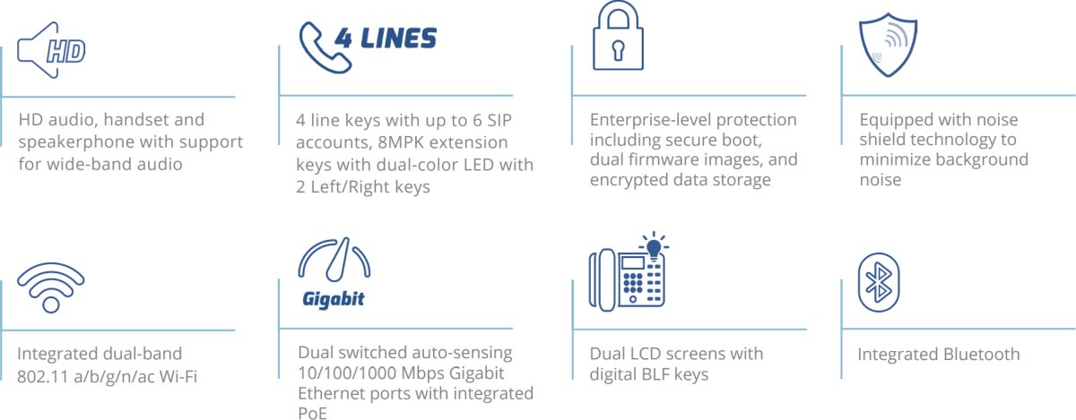 - 4 клавиша за линии с до 6 SIP акаунта, 8MPK клавиша за разширение с двуцветен LED и 2 клавиша за ляво/десно