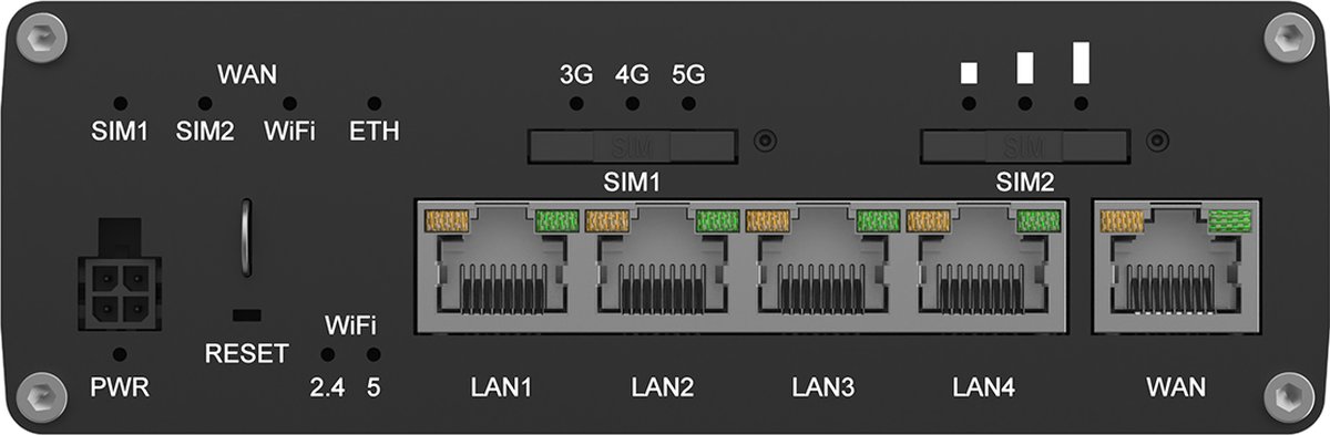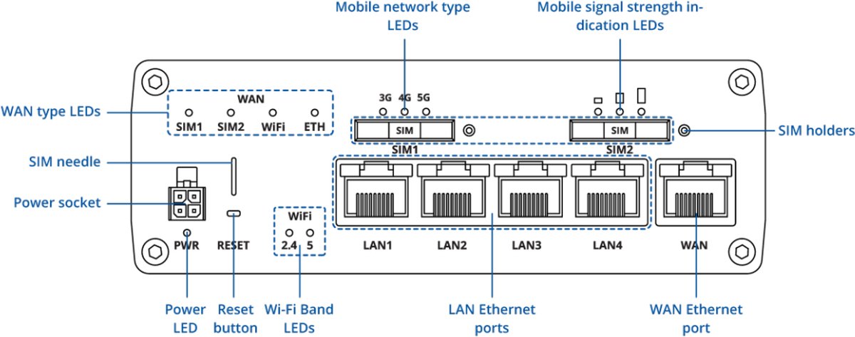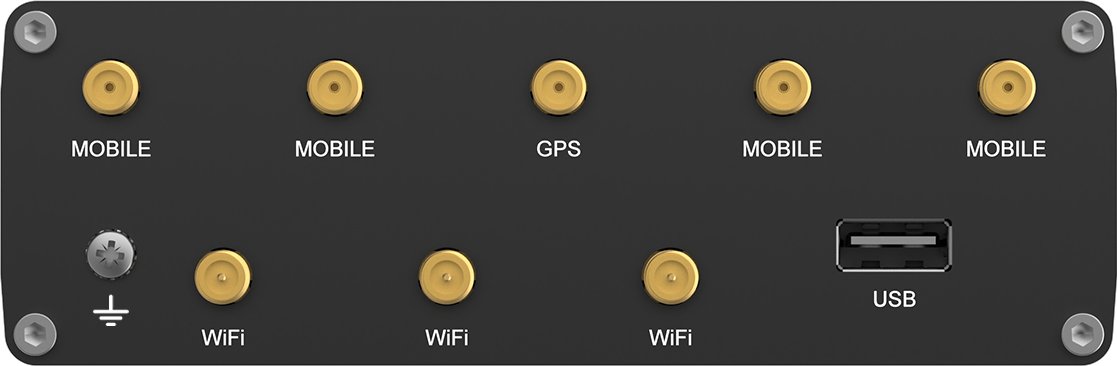 • Интерфейси: 5× 10/100/1000 Mbps (1× WAN, 4× LAN), 4× SMA за 5G, 3× RP-SMA за WiFi, 1× SMA за GNSS, 1× цифров вход, 1× цифров изход, 1× USB, 2× слот за SIM карта (Mini SIM – 2FF)